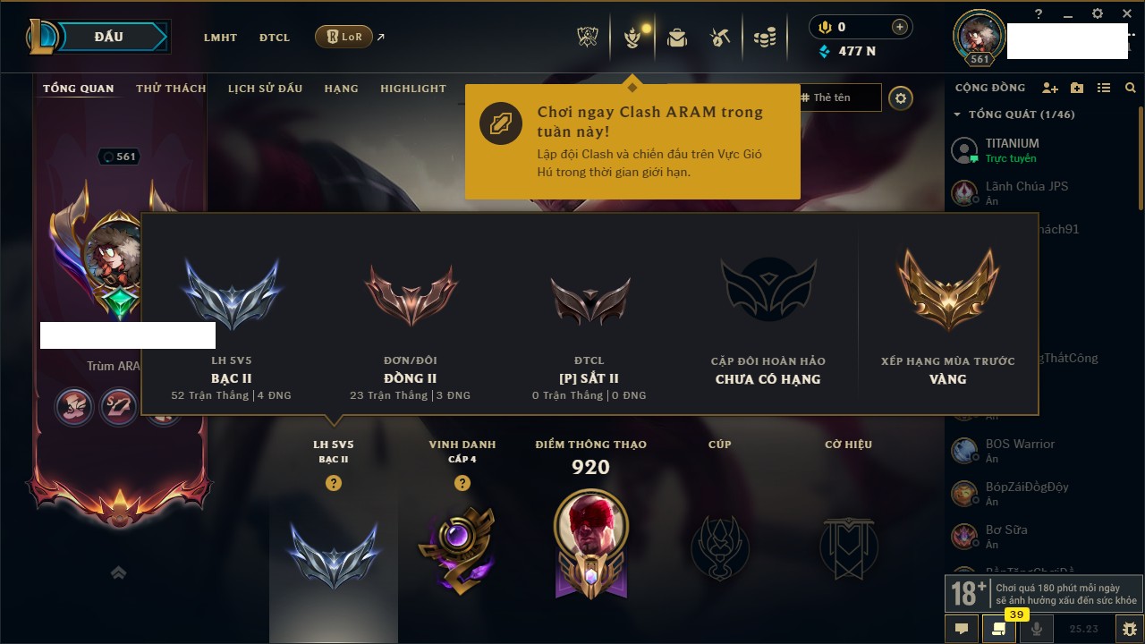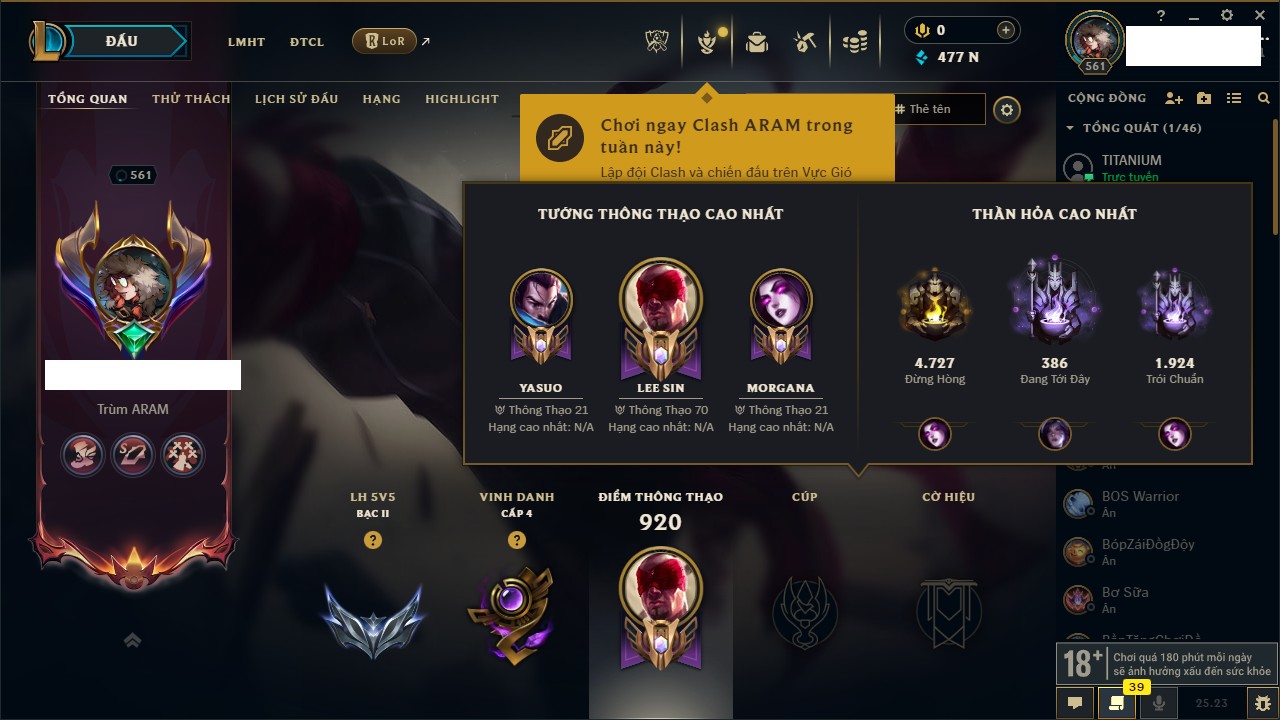 Rank Đơn: Bạc IVKhung: BạcTướng: 171 - Còn 7819 THXTrang Phục: 243Rank ĐTCL: Chưa RankLinh Thú: 102