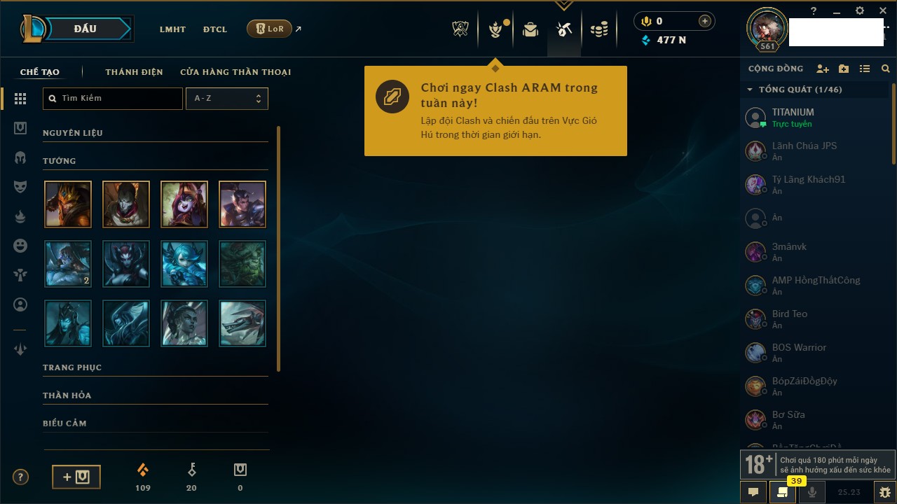 Rank Đơn: Vàng IKhung: Bạch kimTướng: 172 - Còn 108407 THXTrang Phục: 237Rank ĐTCL: Chưa RankLinh Thú: 44