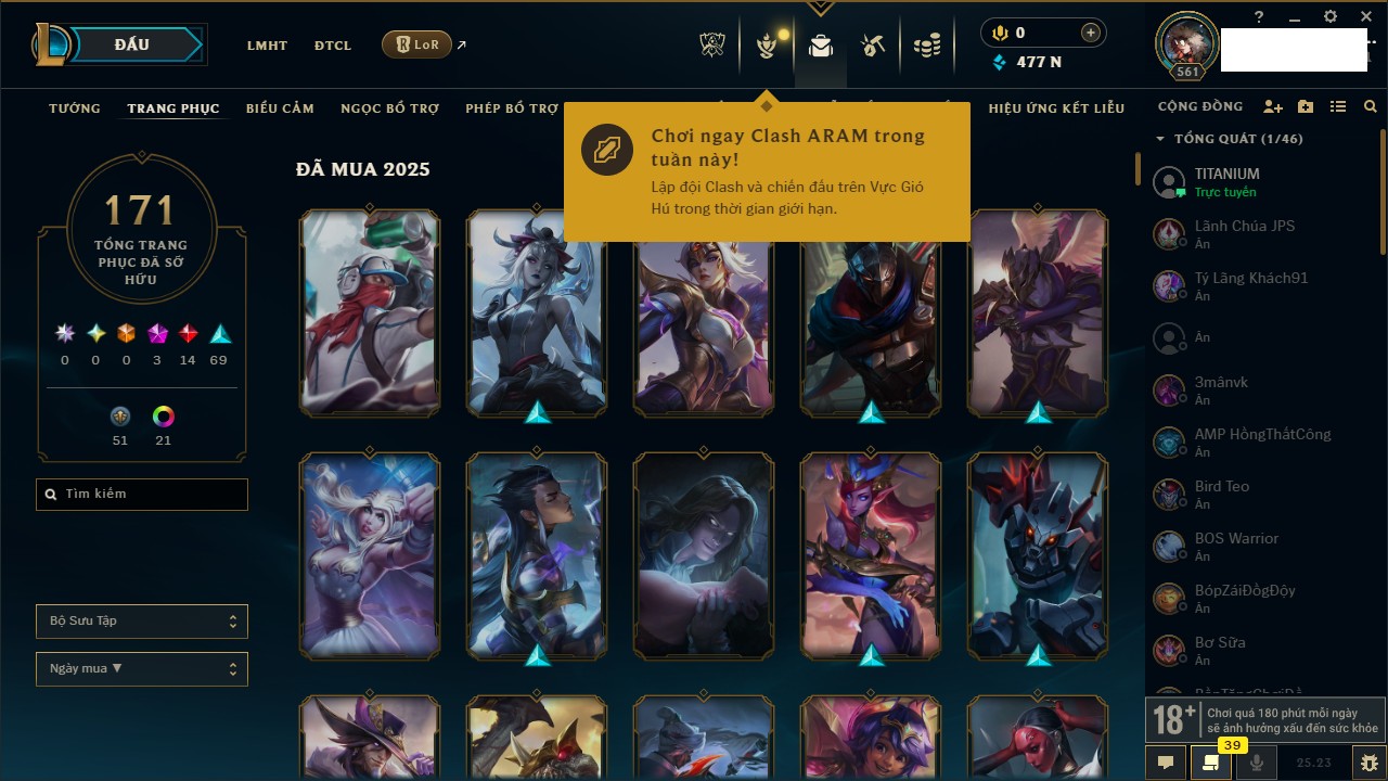 Rank Đơn: Vàng IIIKhung: VàngTướng: 171 - Còn 159339 THXTrang Phục: 218Rank ĐTCL: Lục Bảo IIILinh Thú: 151