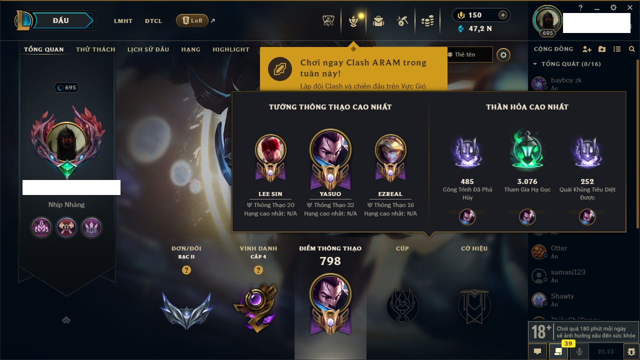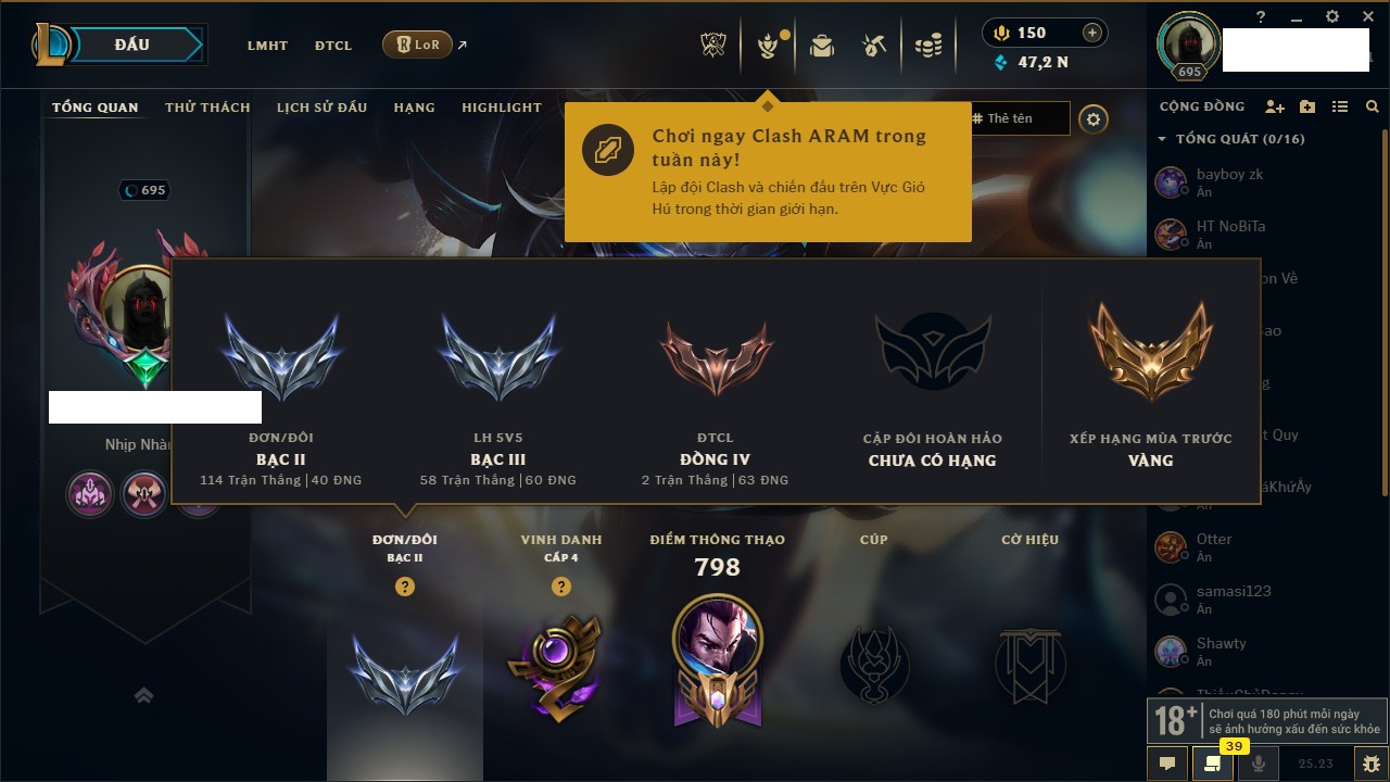 Rank Đơn: Bạc IIKhung: BạcTướng: 171 - Còn 171670 THXTrang Phục: 390Rank ĐTCL: Chưa RankLinh Thú: 41