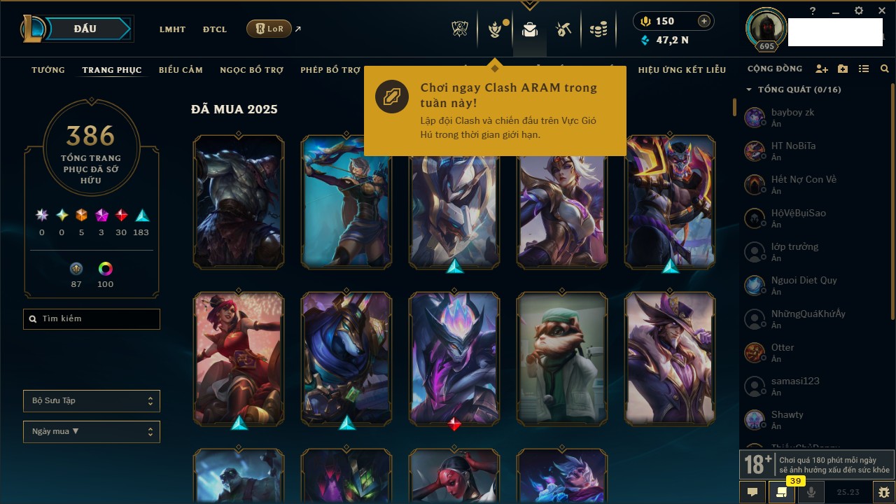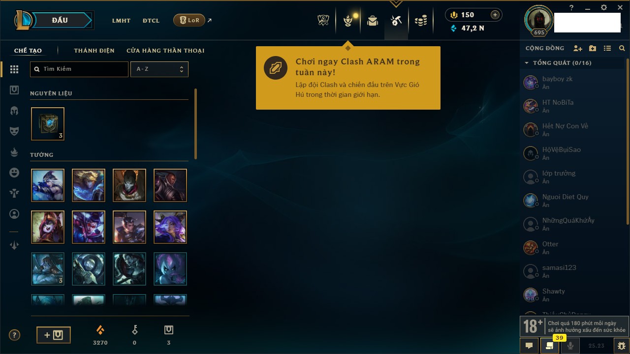 Rank Đơn: Chưa RankKhung: Chưa có khungTướng: 163 - Còn 54470 THXTrang Phục: 370Rank ĐTCL: Chưa RankLinh Thú: 164