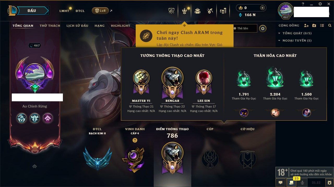 Rank Đơn: Bạch Kim IIKhung: Bạch kimTướng: 171 - Còn 97913 THXTrang Phục: 261Rank ĐTCL: Chưa RankLinh Thú: 46