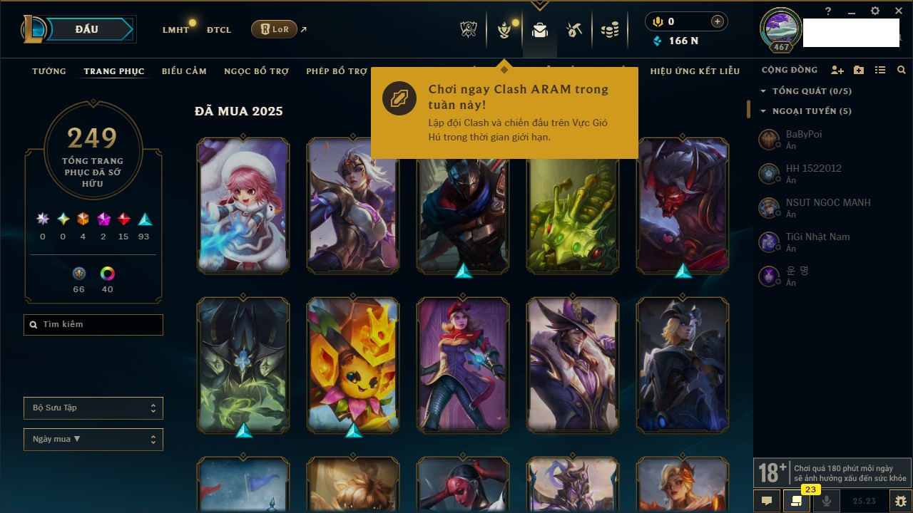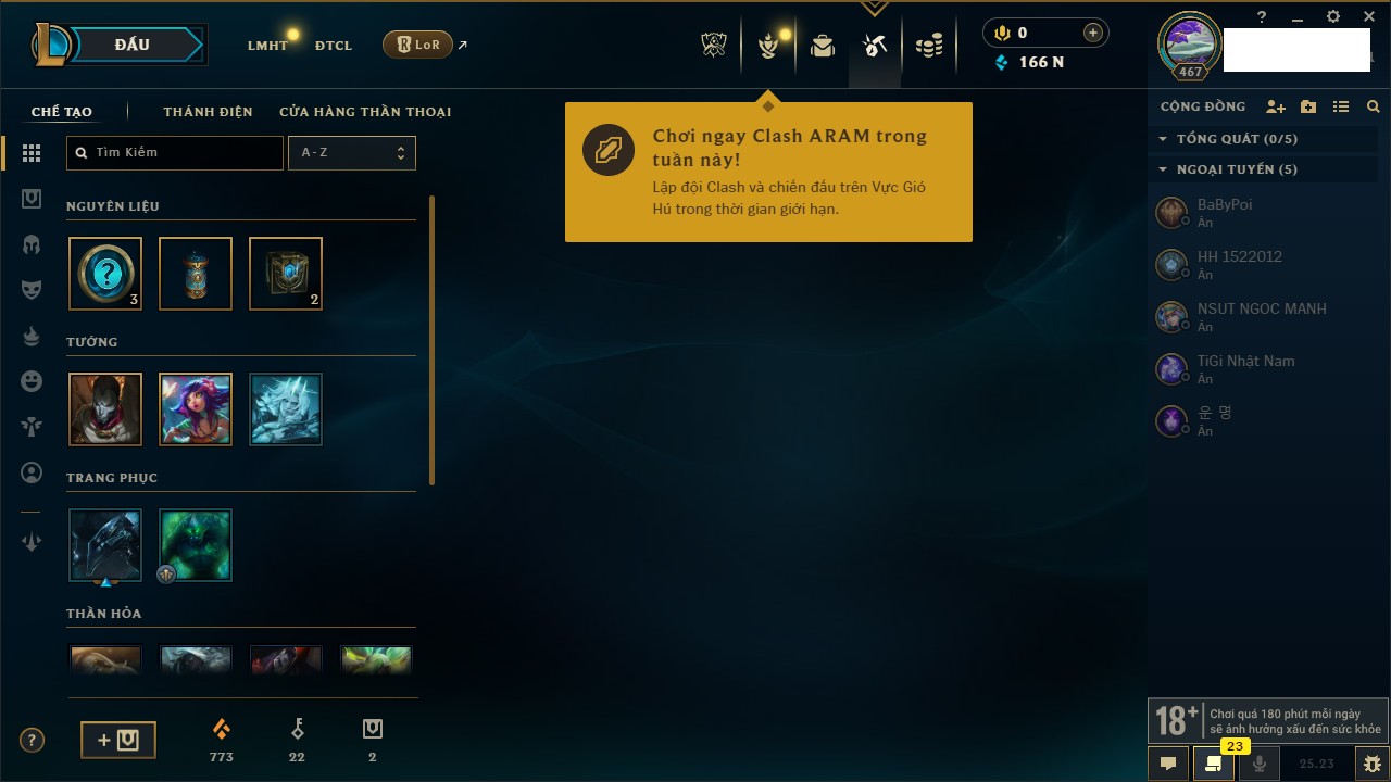 Rank Đơn: Vàng IIIKhung: VàngTướng: 172 - Còn 164704 THXTrang Phục: 255Rank ĐTCL: Kim Cương IVLinh Thú: 156