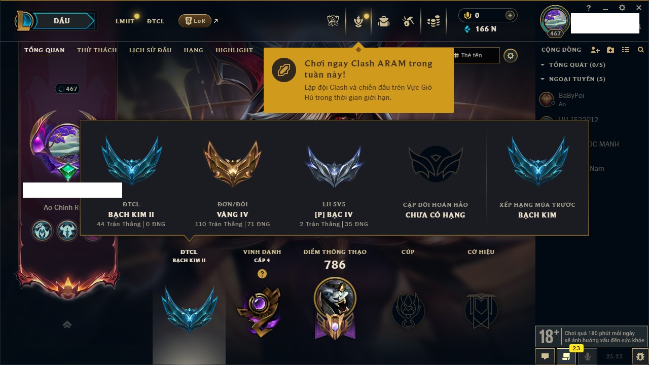 Rank Đơn: Bạch Kim IIIKhung: Bạch kimTướng: 171 - Còn 136108 THXTrang Phục: 261Rank ĐTCL: Bạc IVLinh Thú: 73