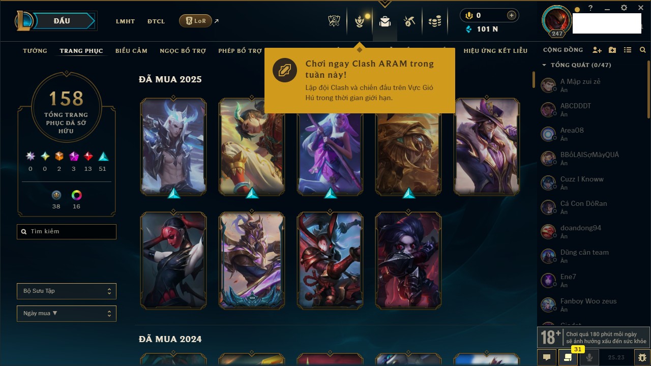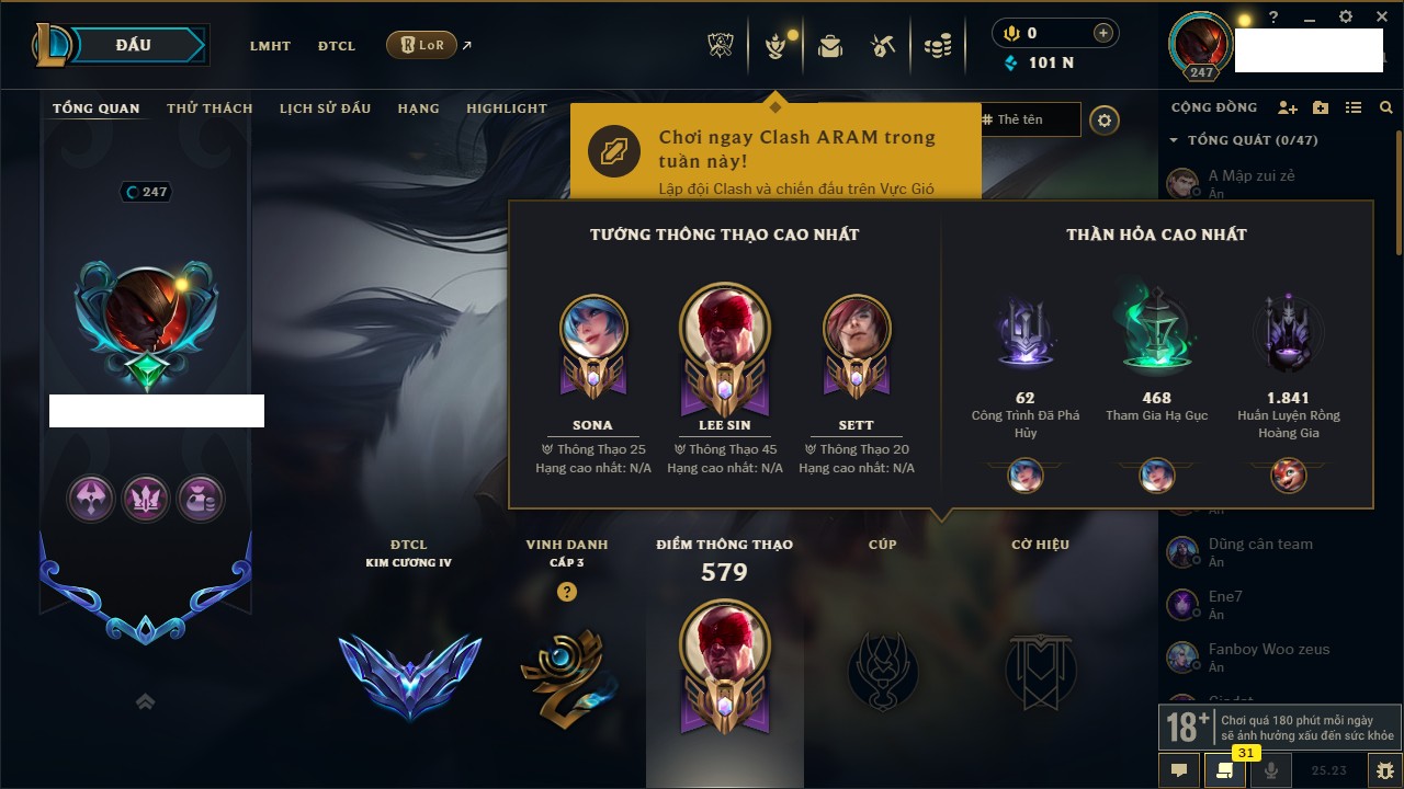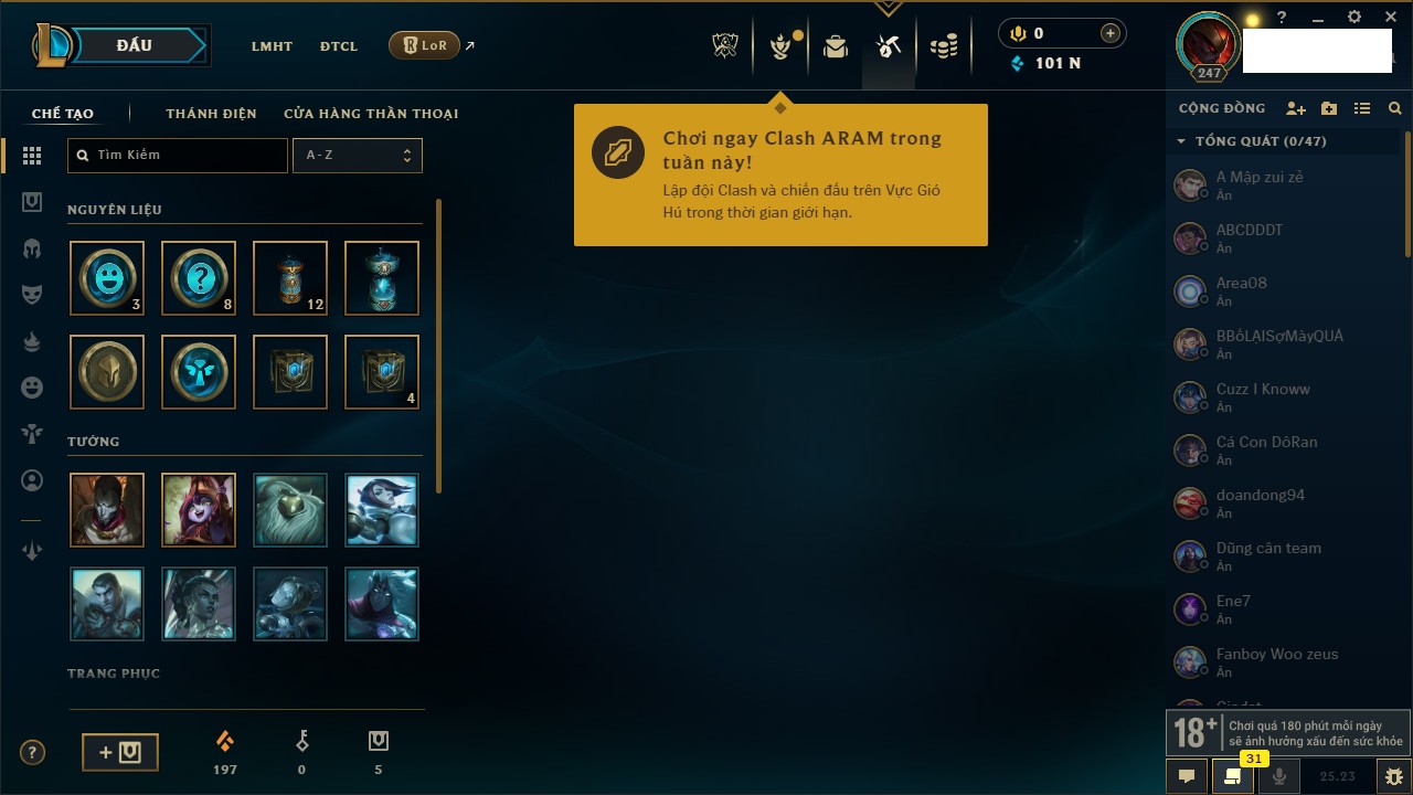 Rank Đơn: Bạc IVKhung: BạcTướng: 171 - Còn 102637 THXTrang Phục: 169Rank ĐTCL: Vàng IILinh Thú: 127