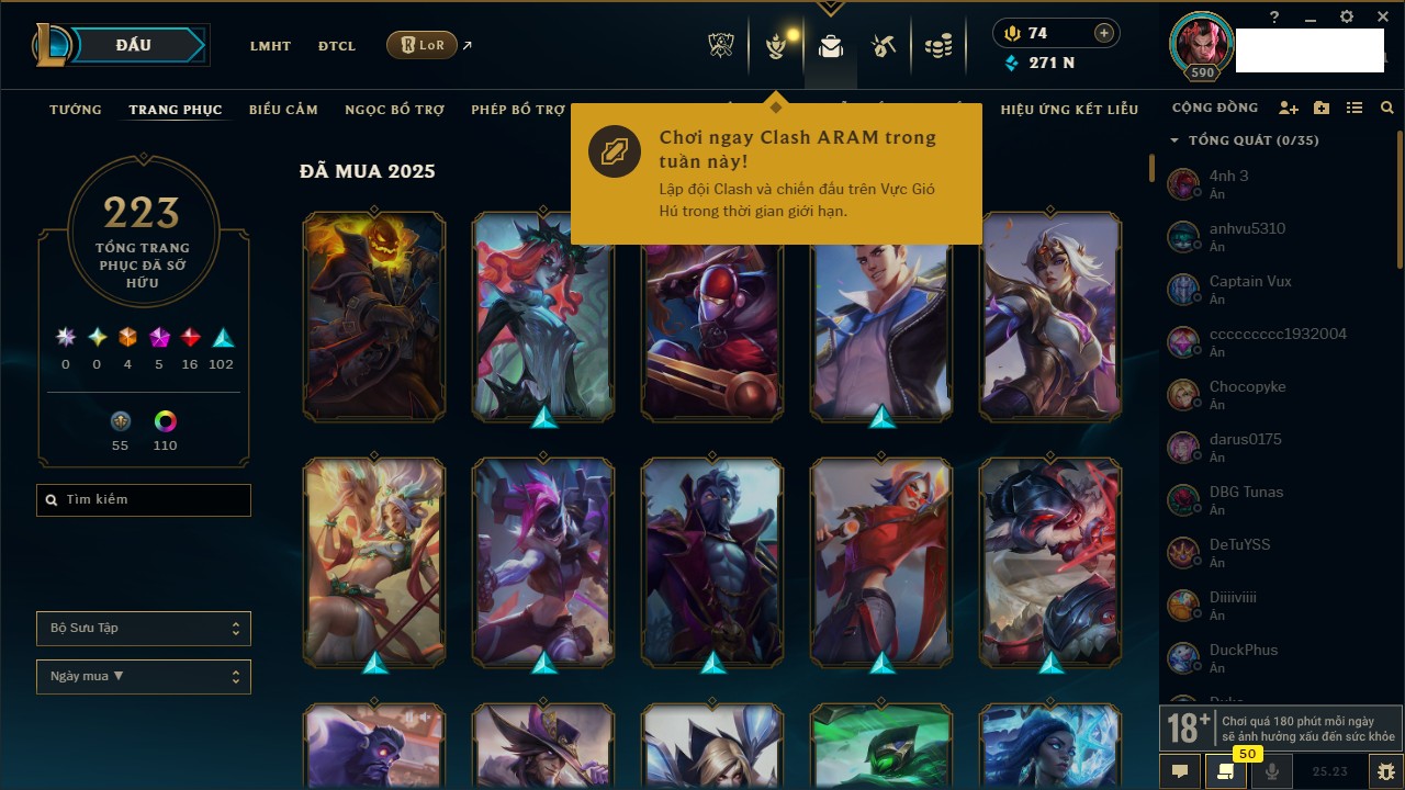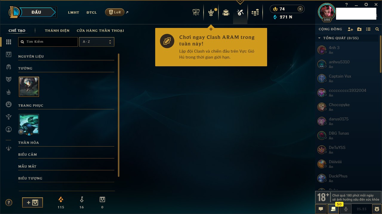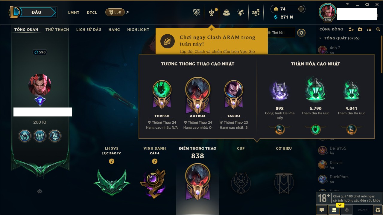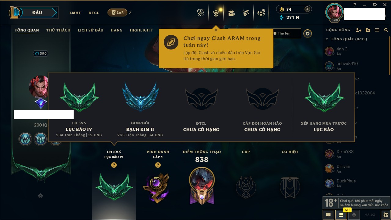 Rank Đơn: Vàng IIIKhung: VàngTướng: 172 - Còn 164704 THXTrang Phục: 255Rank ĐTCL: Kim Cương IVLinh Thú: 156
