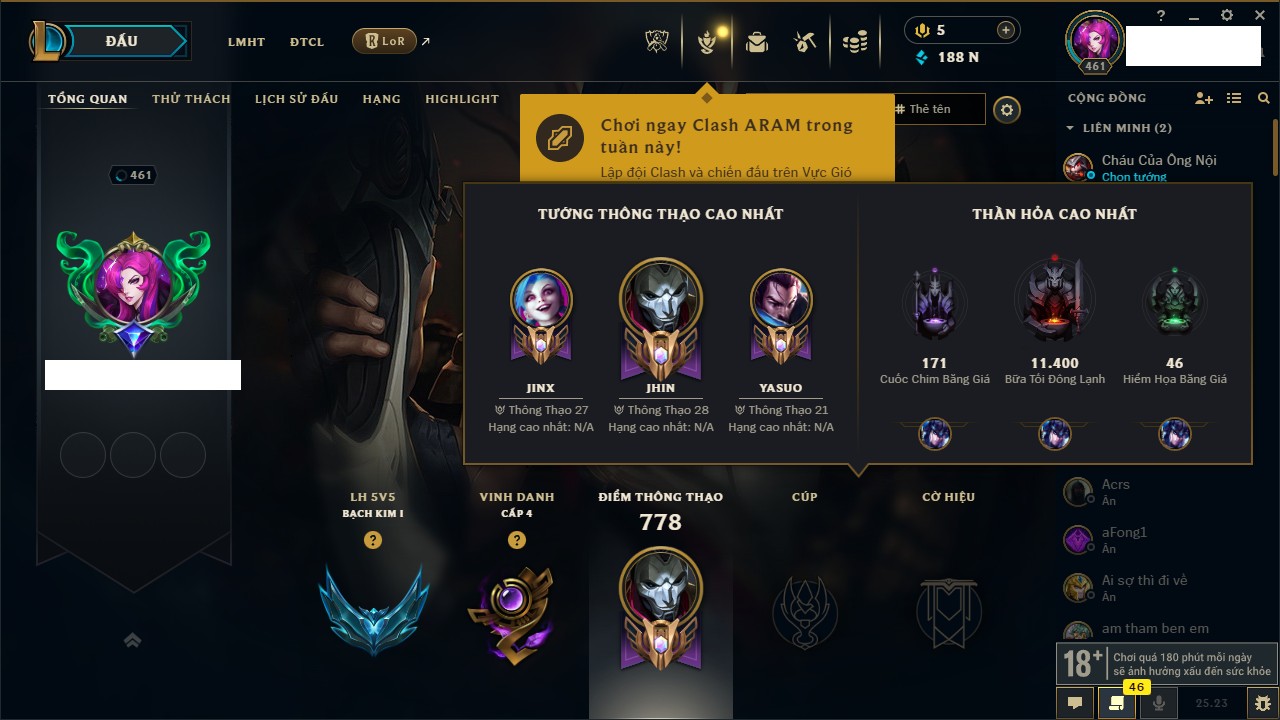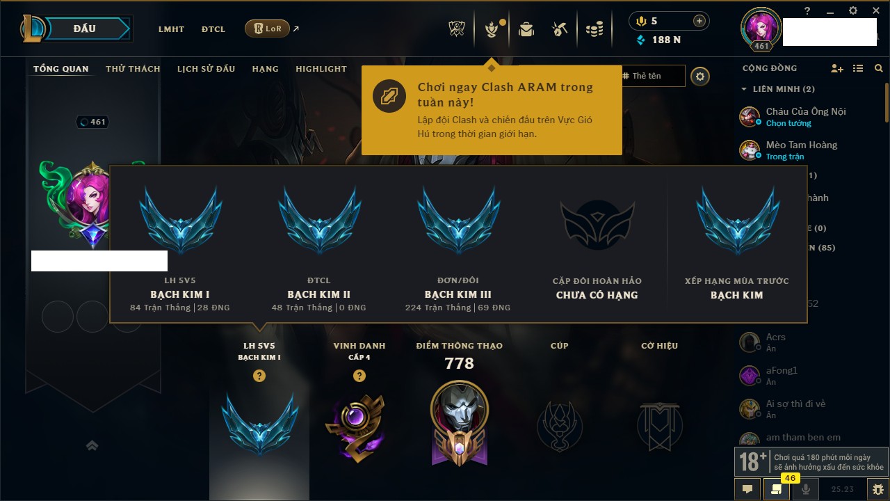 Rank Đơn: Vàng IIKhung: Bạch kimTướng: 172 - Còn 123420 THXTrang Phục: 231Rank ĐTCL: Bạch Kim IVLinh Thú: 213