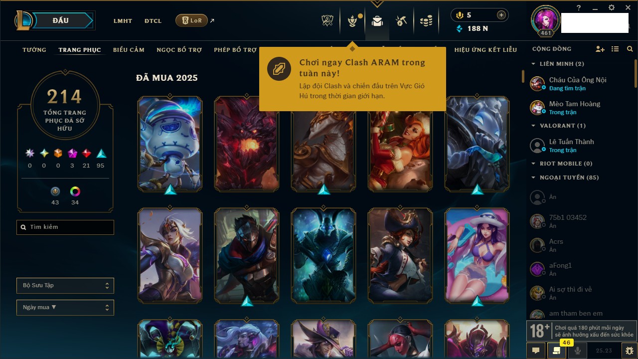 Rank Đơn: Vàng IIIKhung: VàngTướng: 172 - Còn 200315 THXTrang Phục: 87Rank ĐTCL: Chưa RankLinh Thú: 136