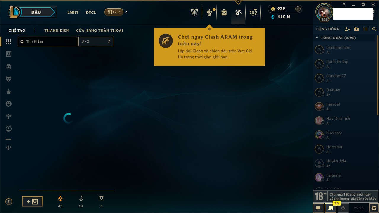 Rank Đơn: Vàng IIIKhung: VàngTướng: 172 - Còn 200315 THXTrang Phục: 87Rank ĐTCL: Chưa RankLinh Thú: 136