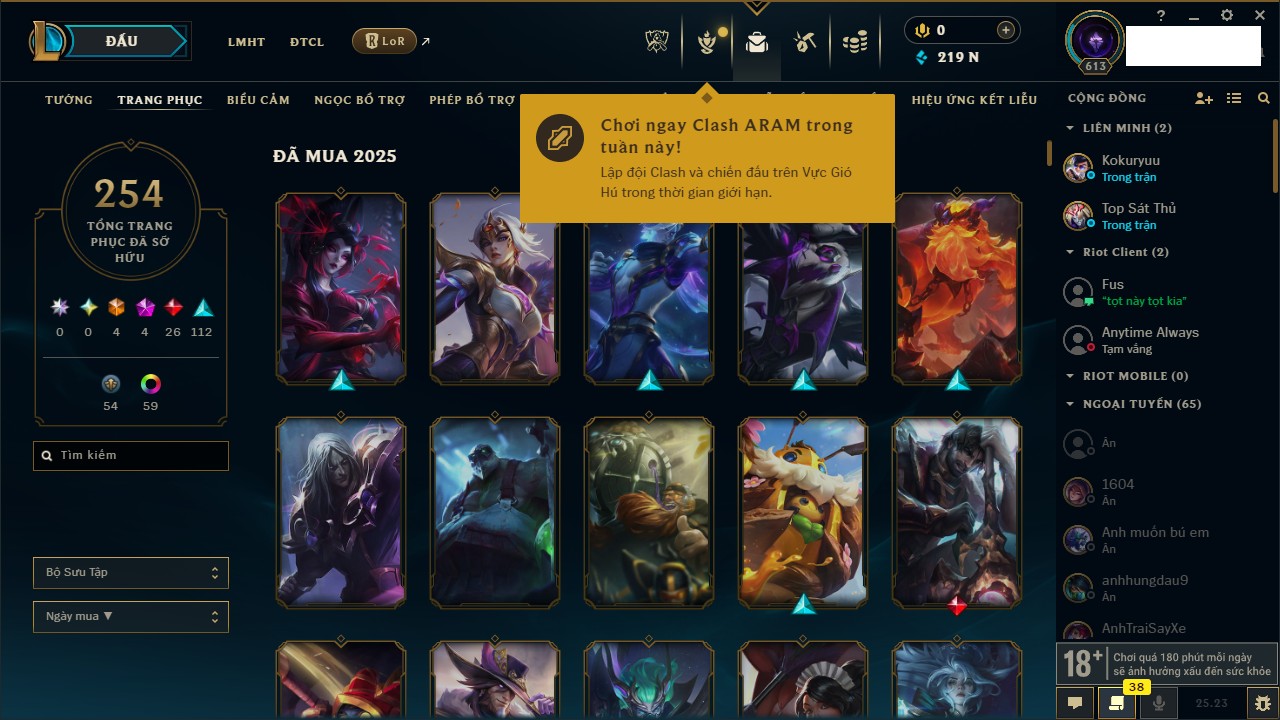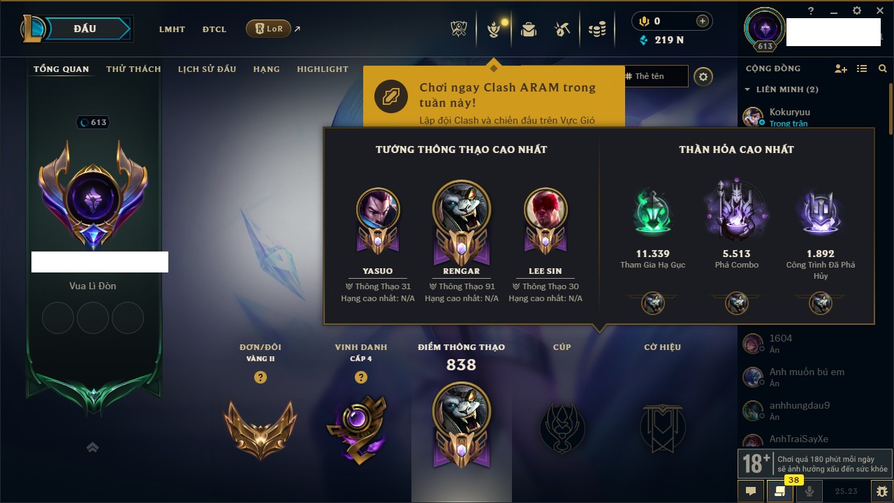 Rank Đơn: Vàng IIKhung: VàngTướng: 171 - Còn 219803 THXTrang Phục: 254Rank ĐTCL: Chưa RankLinh Thú: 78
