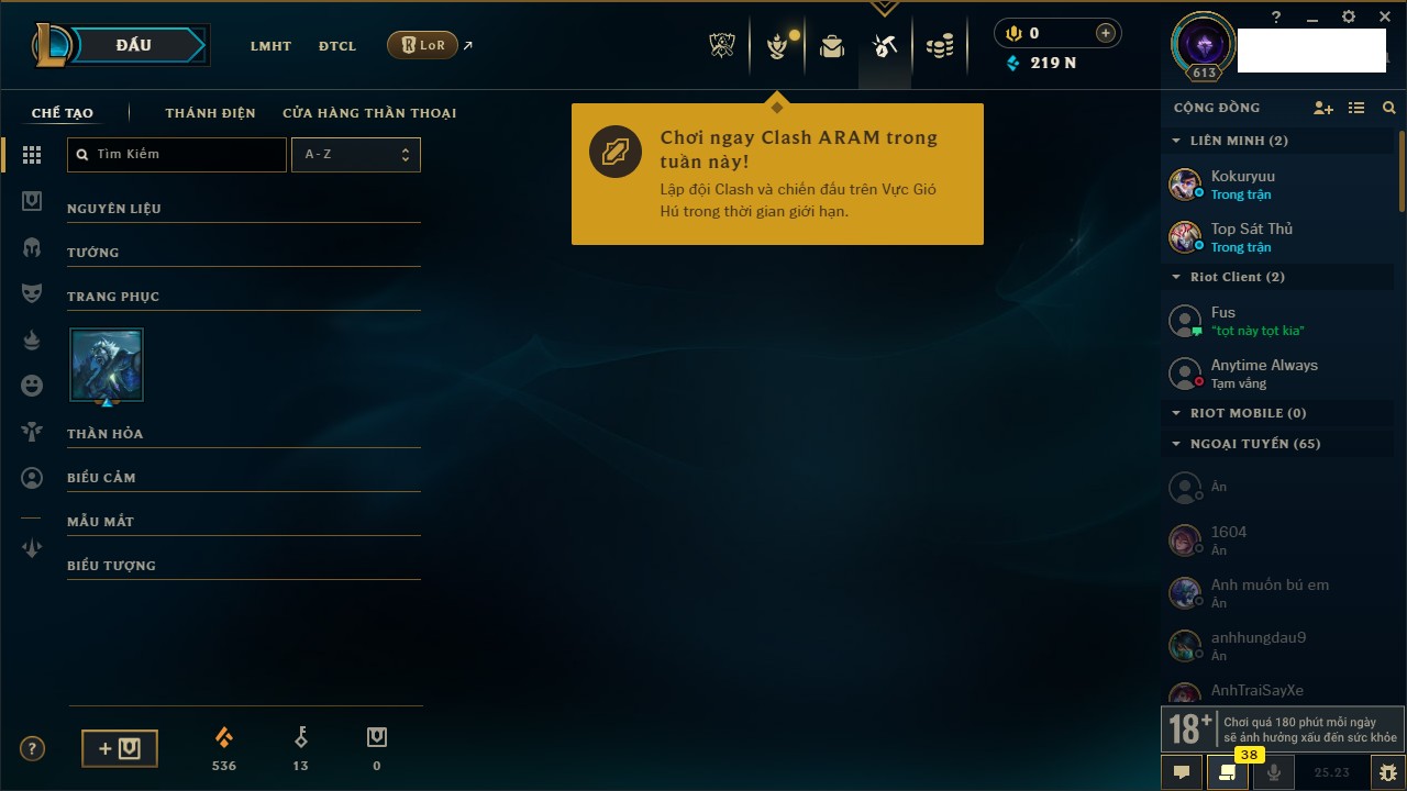 Rank Đơn: Bạch Kim IVKhung: VàngTướng: 171 - Còn 130578 THXTrang Phục: 253Rank ĐTCL: Chưa RankLinh Thú: 20