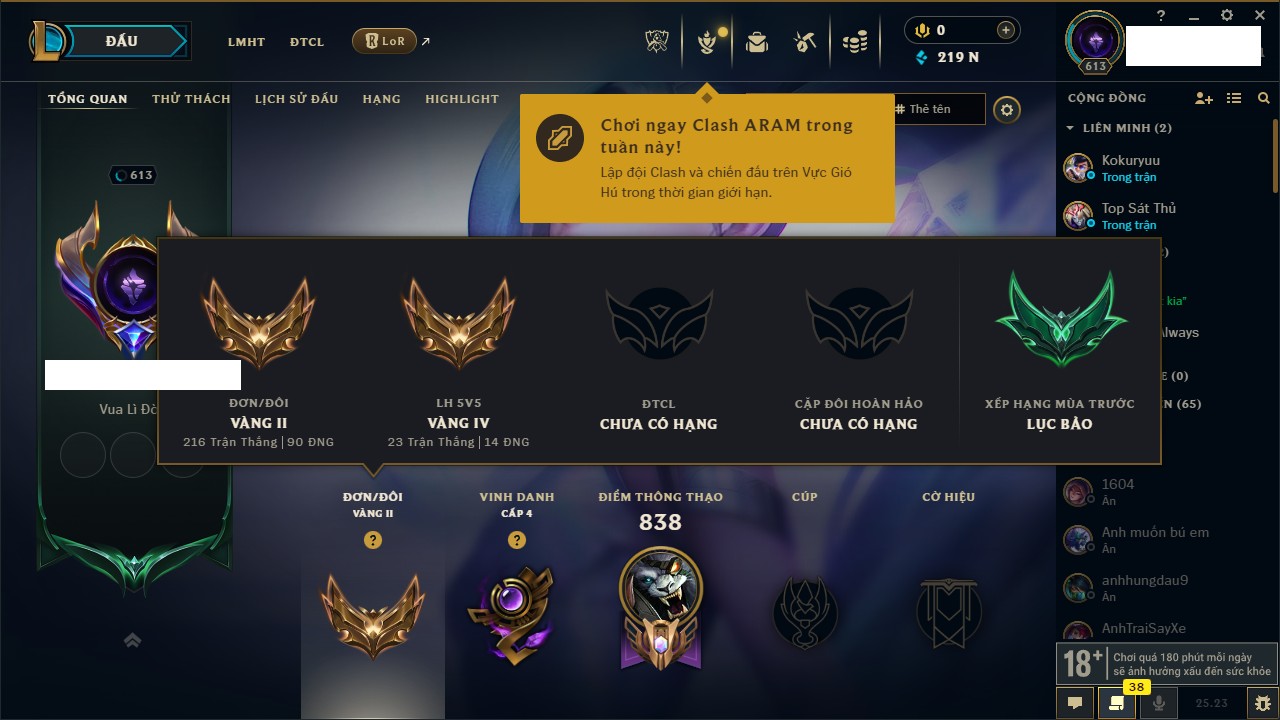 Rank Đơn: Vàng IIIKhung: VàngTướng: 171 - Còn 212486 THXTrang Phục: 201Rank ĐTCL: Bạc ILinh Thú: 79