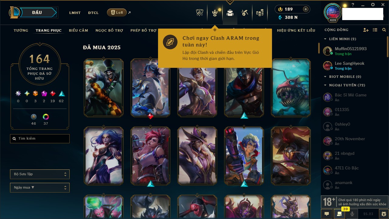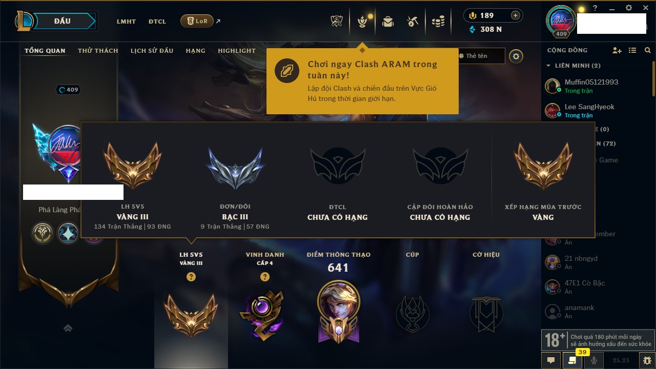Rank Đơn: Vàng IIKhung: VàngTướng: 171 - Còn 34018 THXTrang Phục: 250Rank ĐTCL: Sắt IILinh Thú: 19