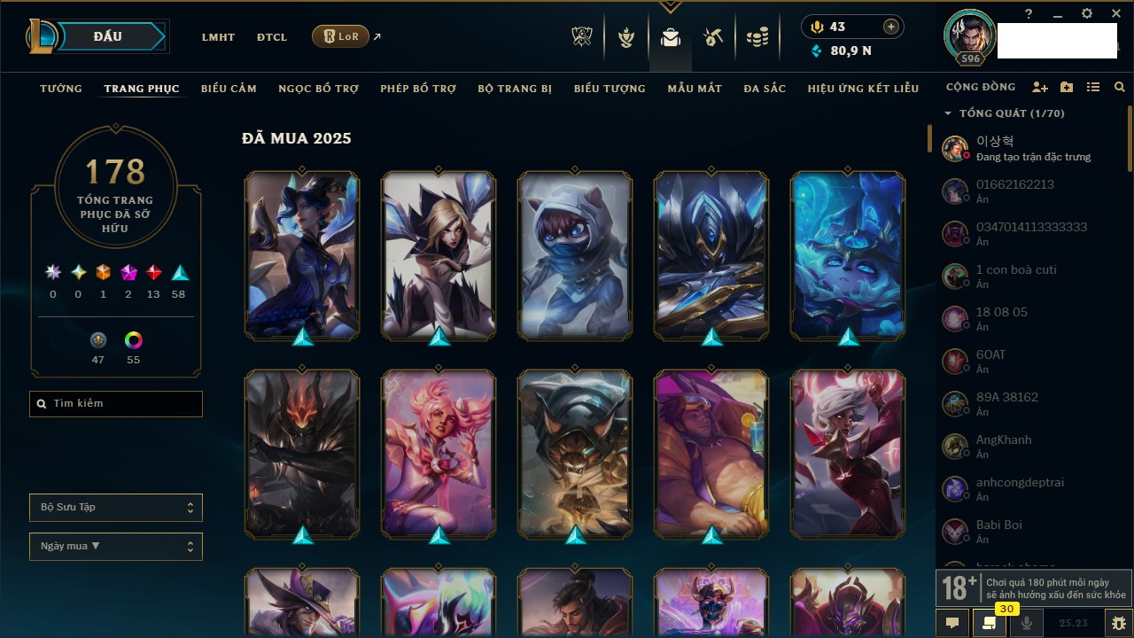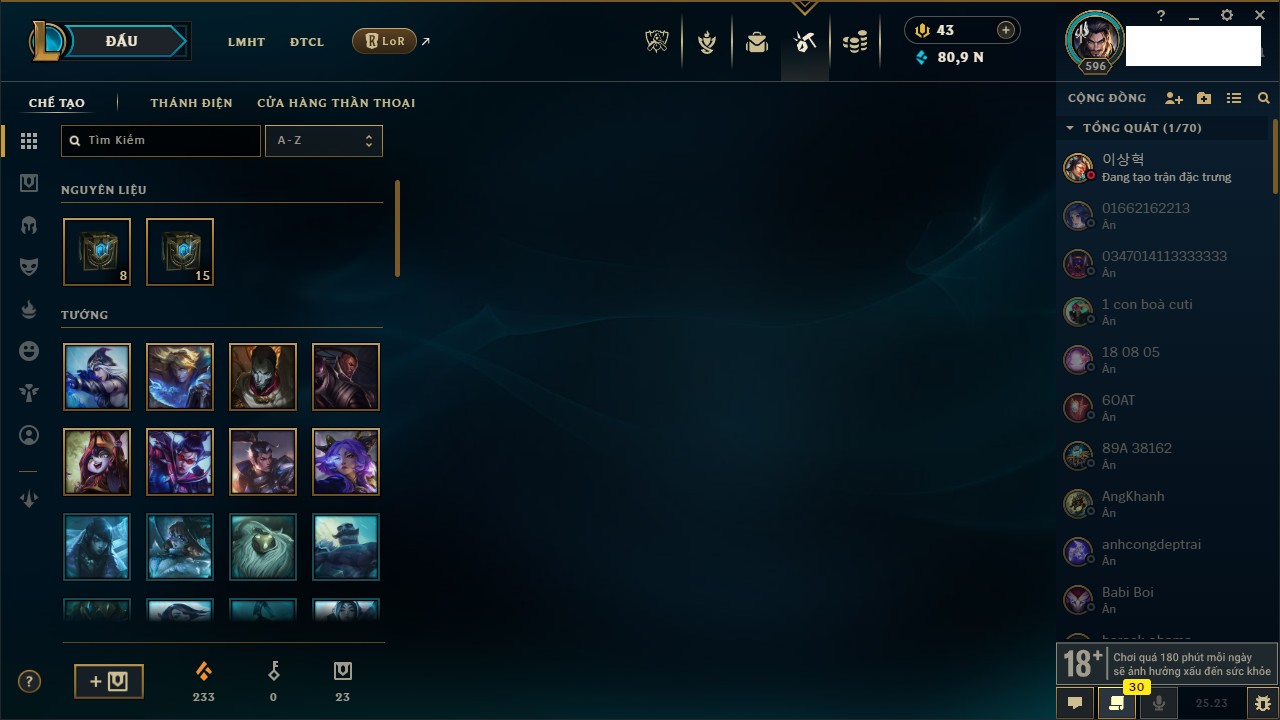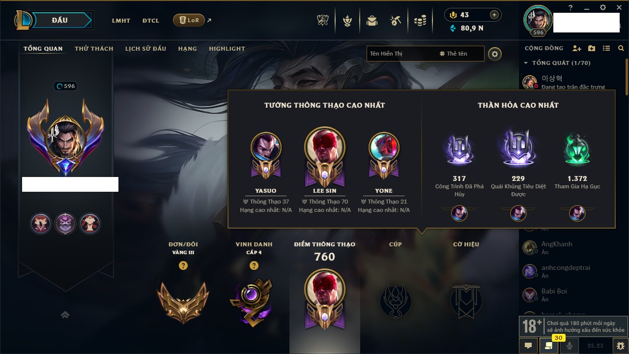 Rank Đơn: Vàng IVKhung: BạcTướng: 166 - Còn 180925 THXTrang Phục: 163Rank ĐTCL: Chưa RankLinh Thú: 67