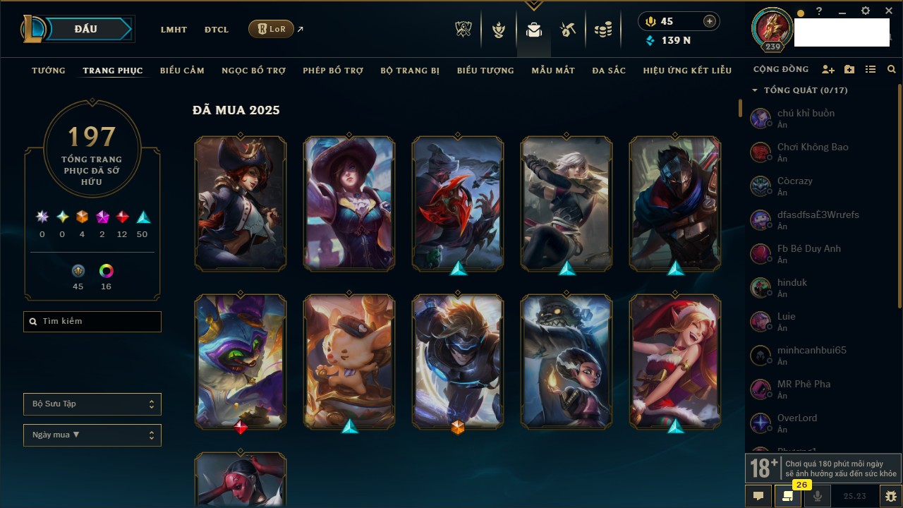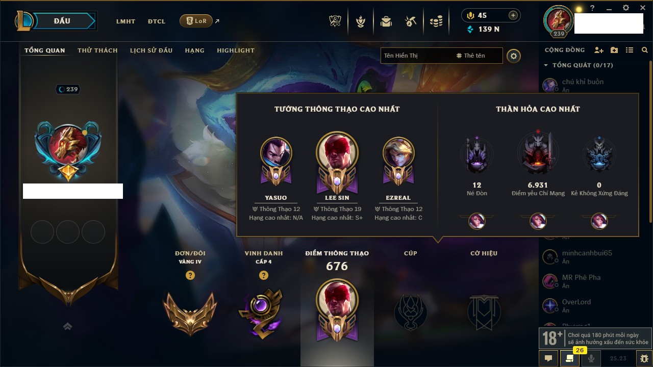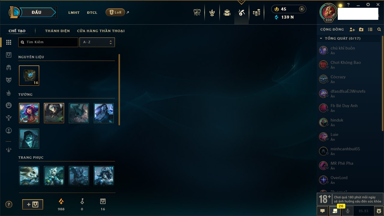Rank Đơn: Bạc IIIKhung: BạcTướng: 171 - Còn 51045 THXTrang Phục: 220Rank ĐTCL: Sắt IILinh Thú: 141