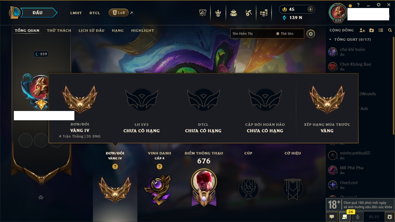 Rank Đơn: Vàng IVKhung: VàngTướng: 170 - Còn 84355 THXTrang Phục: 199Rank ĐTCL: Chưa RankLinh Thú: 116