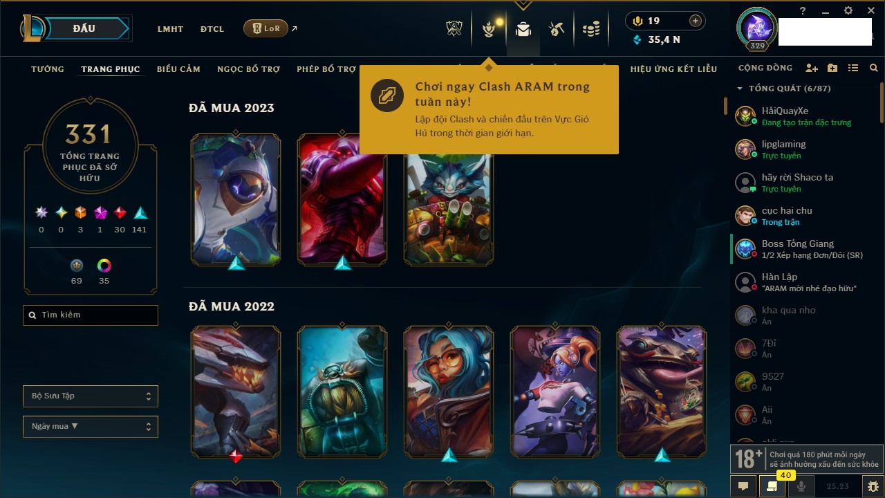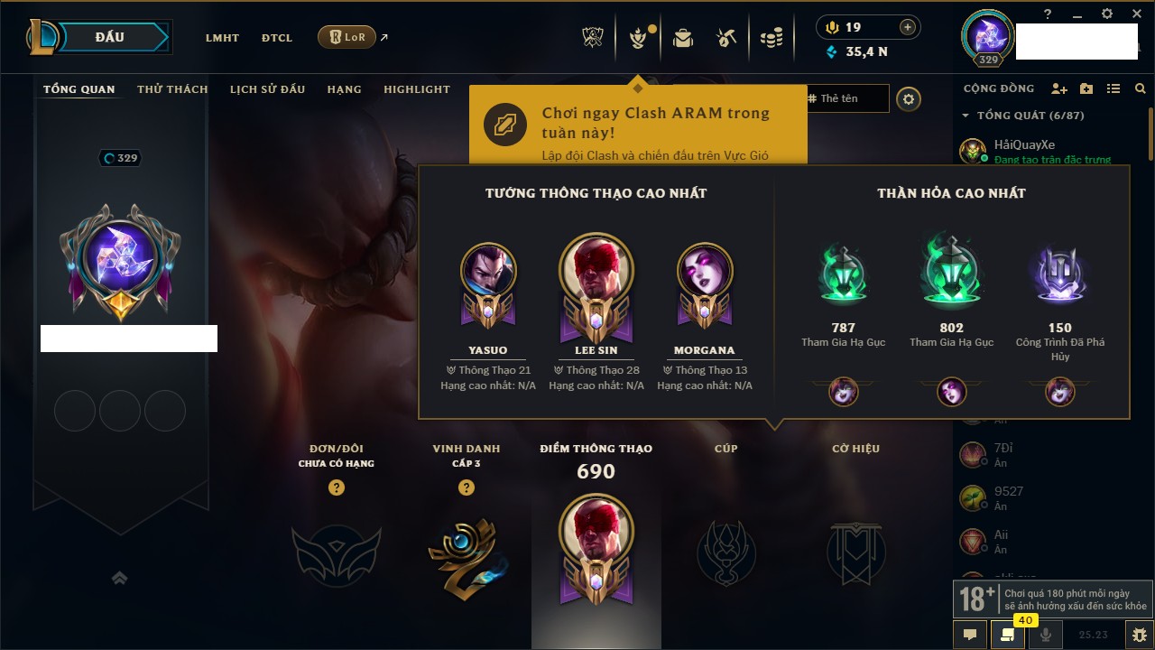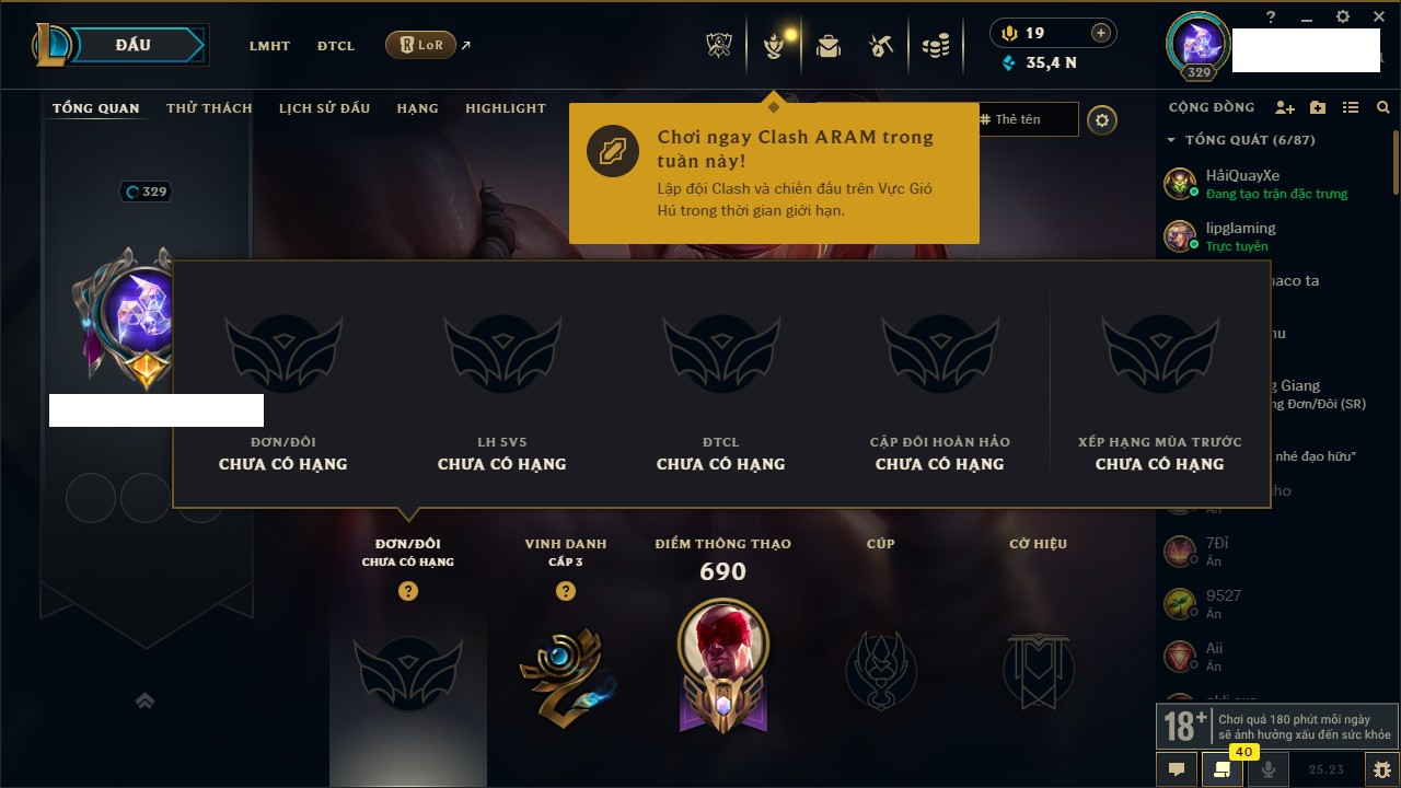 Rank Đơn: Chưa RankKhung: Chưa có khungTướng: 41 - Còn 11257 THXTrang Phục: 11Rank ĐTCL: Chưa RankLinh Thú: 84
