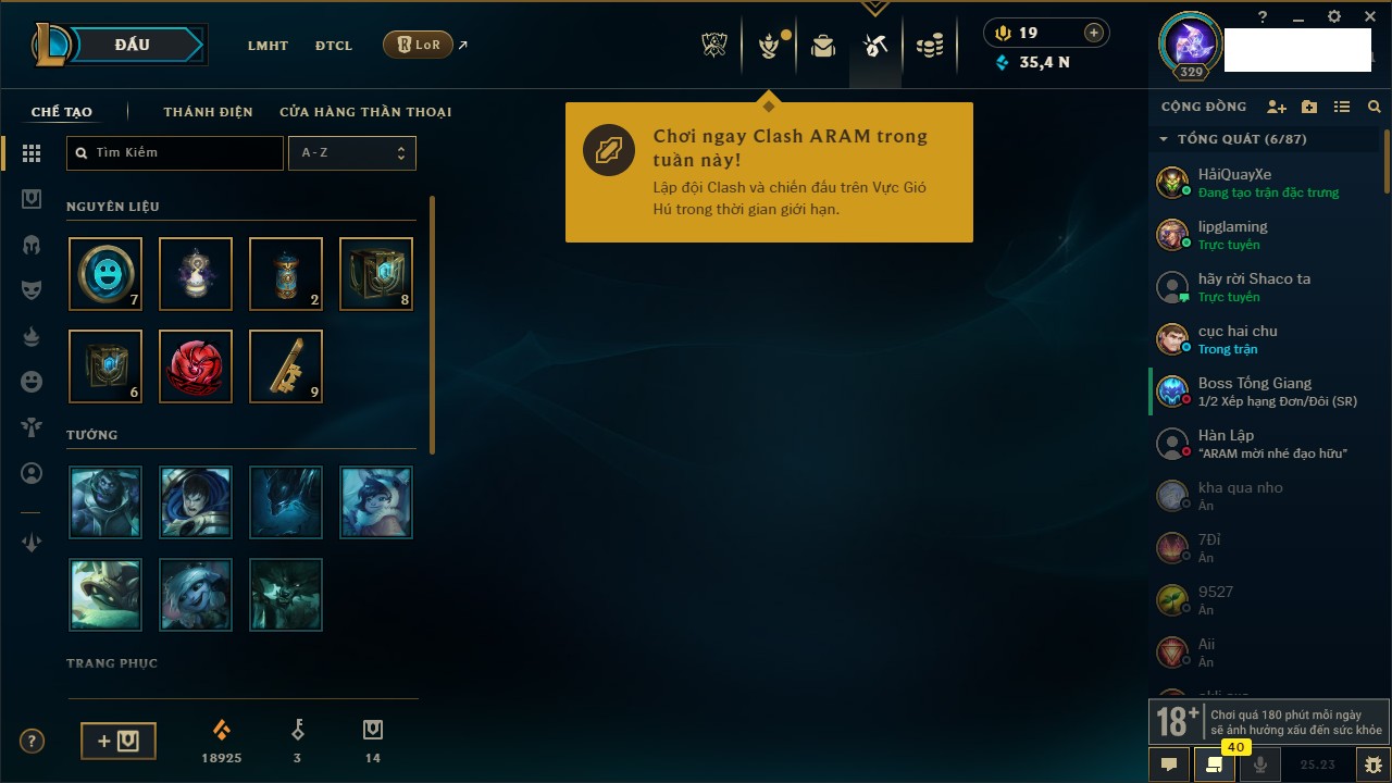 Rank Đơn: Chưa RankKhung: VàngTướng: 171 - Còn 660284 THXTrang Phục: 199Rank ĐTCL: Chưa RankLinh Thú: 34