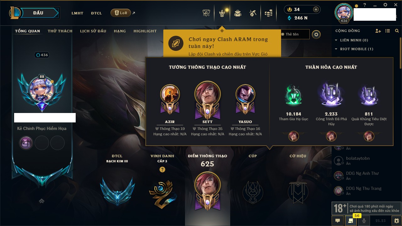 Rank Đơn: Bạc IVKhung: VàngTướng: 172 - Còn 358384 THXTrang Phục: 177Rank ĐTCL: Lục Bảo IILinh Thú: 211
