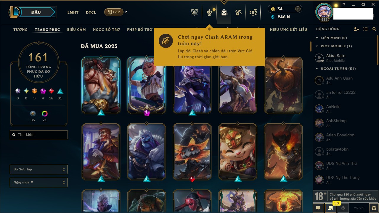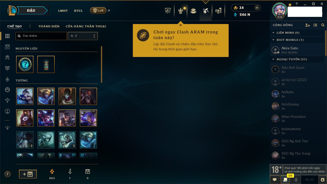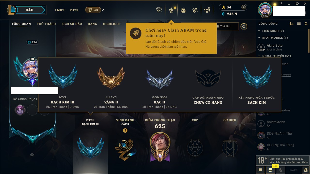 Rank Đơn: Vàng IVKhung: BạcTướng: 166 - Còn 180925 THXTrang Phục: 163Rank ĐTCL: Chưa RankLinh Thú: 67