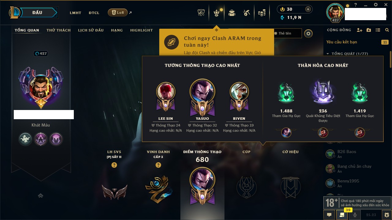 Rank Đơn: Vàng IVKhung: VàngTướng: 171 - Còn 660284 THXTrang Phục: 199Rank ĐTCL: Chưa RankLinh Thú: 34