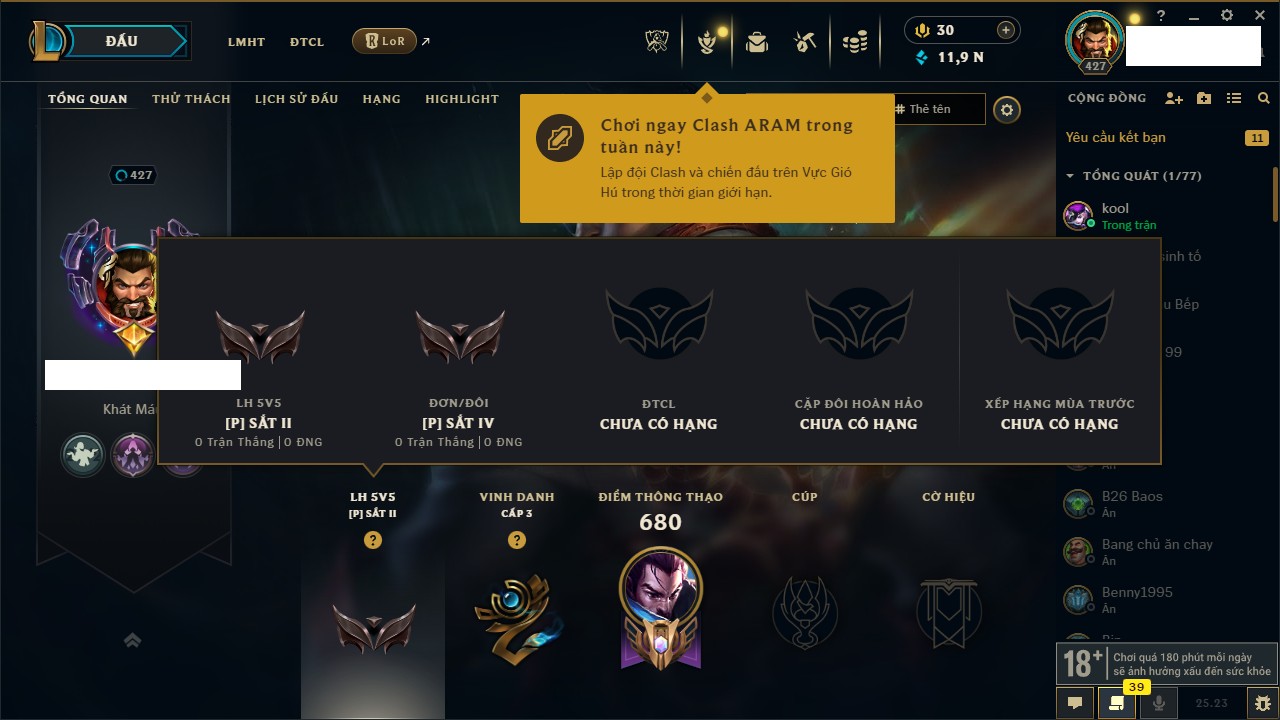 Rank Đơn: Vàng IKhung: BạcTướng: 171 - Còn 60584 THXTrang Phục: 286Rank ĐTCL: Vàng IIILinh Thú: 117