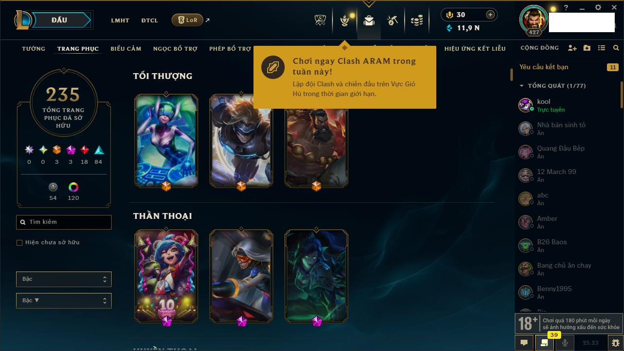 Rank Đơn: Vàng IIIKhung: VàngTướng: 171 - Còn 88128 THXTrang Phục: 329Rank ĐTCL: Chưa RankLinh Thú: 41