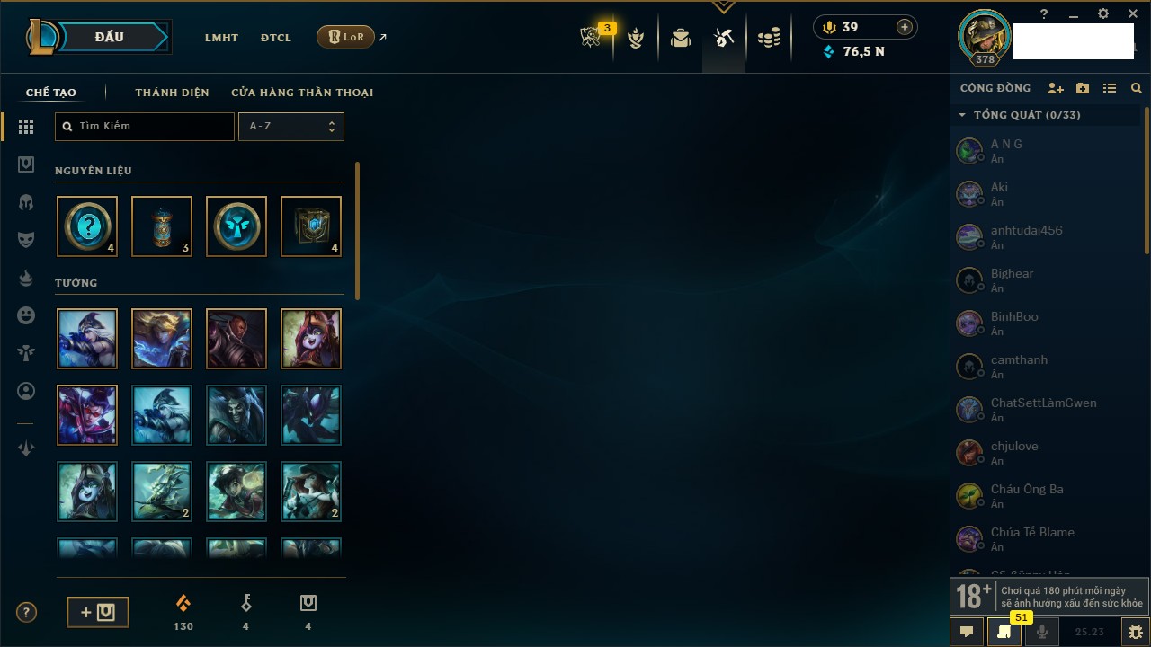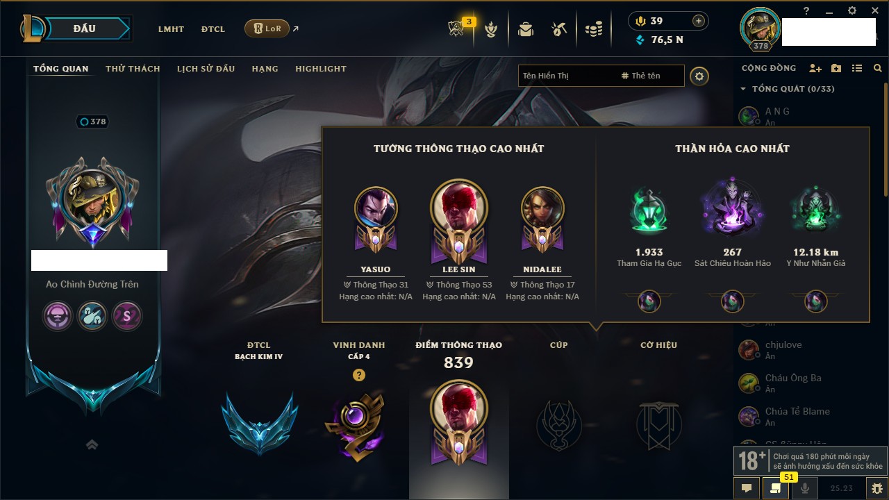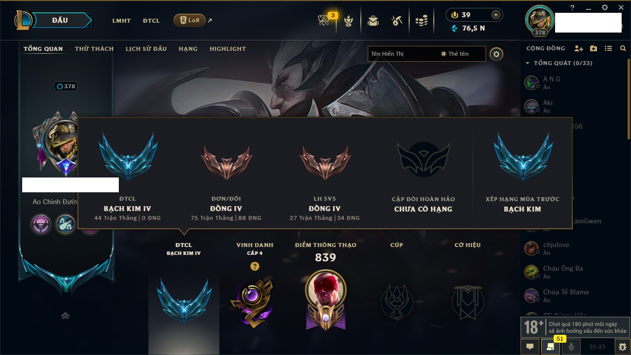 Rank Đơn: Vàng IKhung: BạcTướng: 171 - Còn 60584 THXTrang Phục: 286Rank ĐTCL: Vàng IIILinh Thú: 117