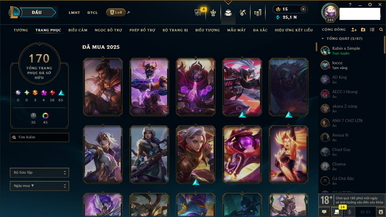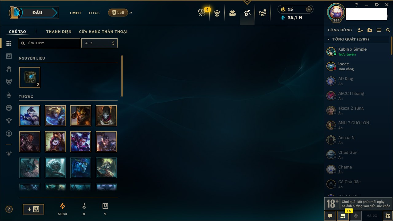 Rank Đơn: Bạc IIIKhung: BạcTướng: 171 - Còn 51045 THXTrang Phục: 220Rank ĐTCL: Sắt IILinh Thú: 141