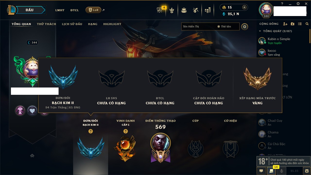 Rank Đơn: Bạch Kim IIKhung: VàngTướng: 171 - Còn 140736 THXTrang Phục: 182Rank ĐTCL: Chưa RankLinh Thú: 14