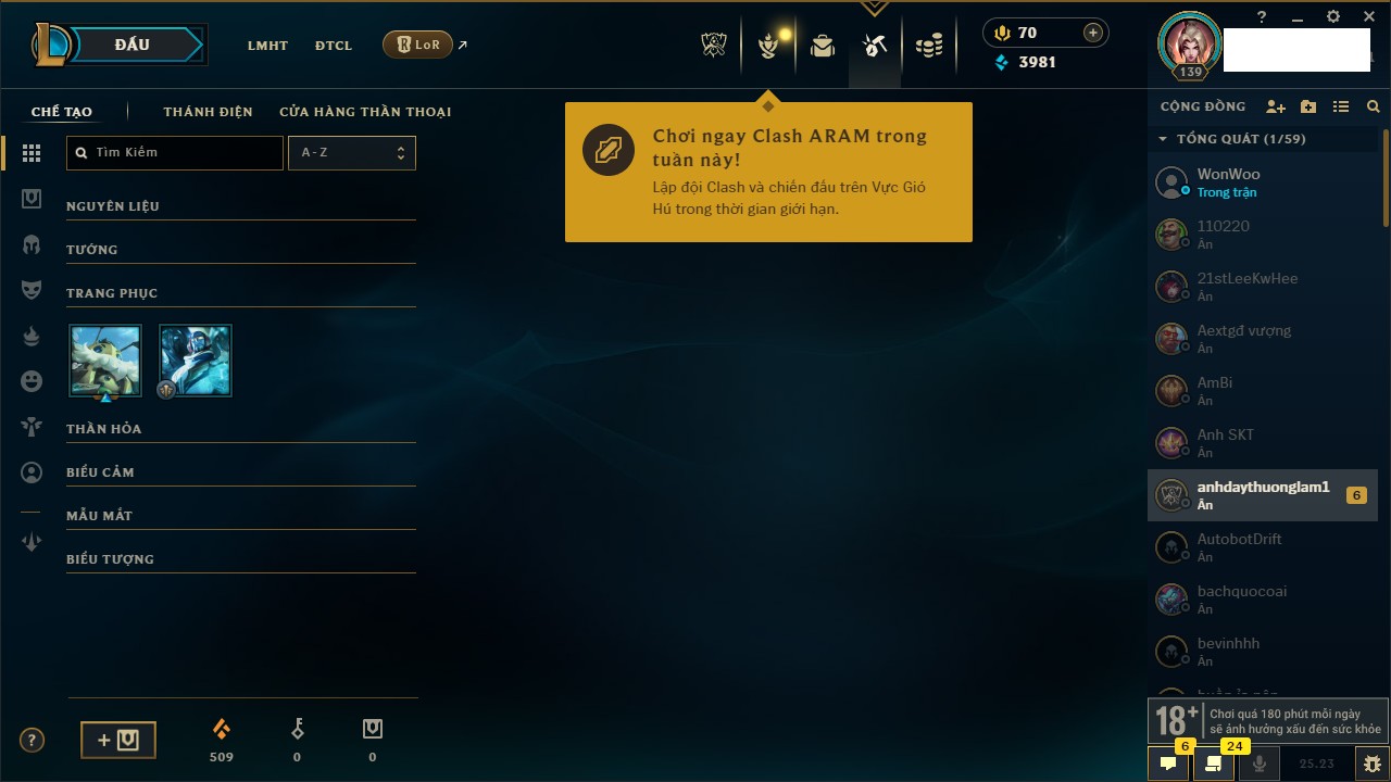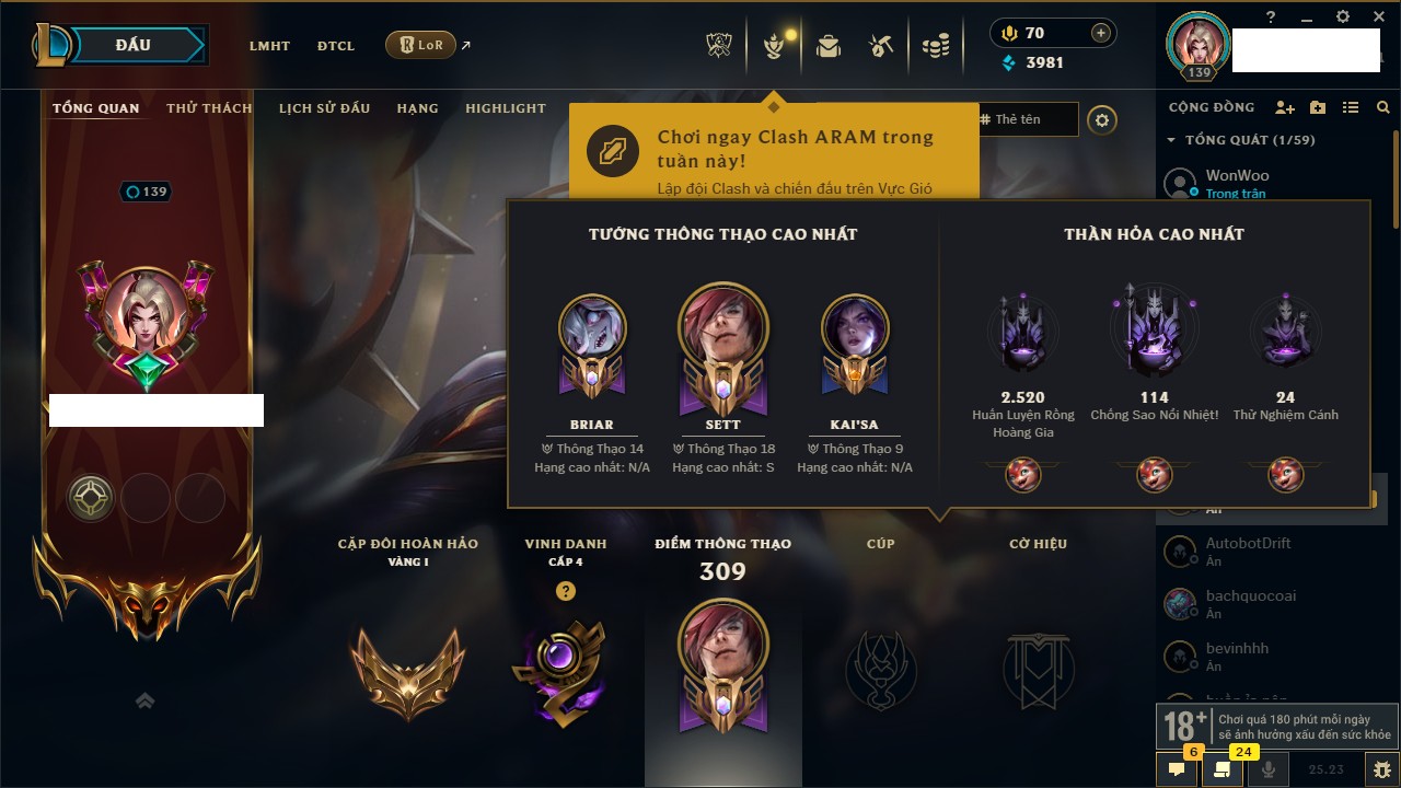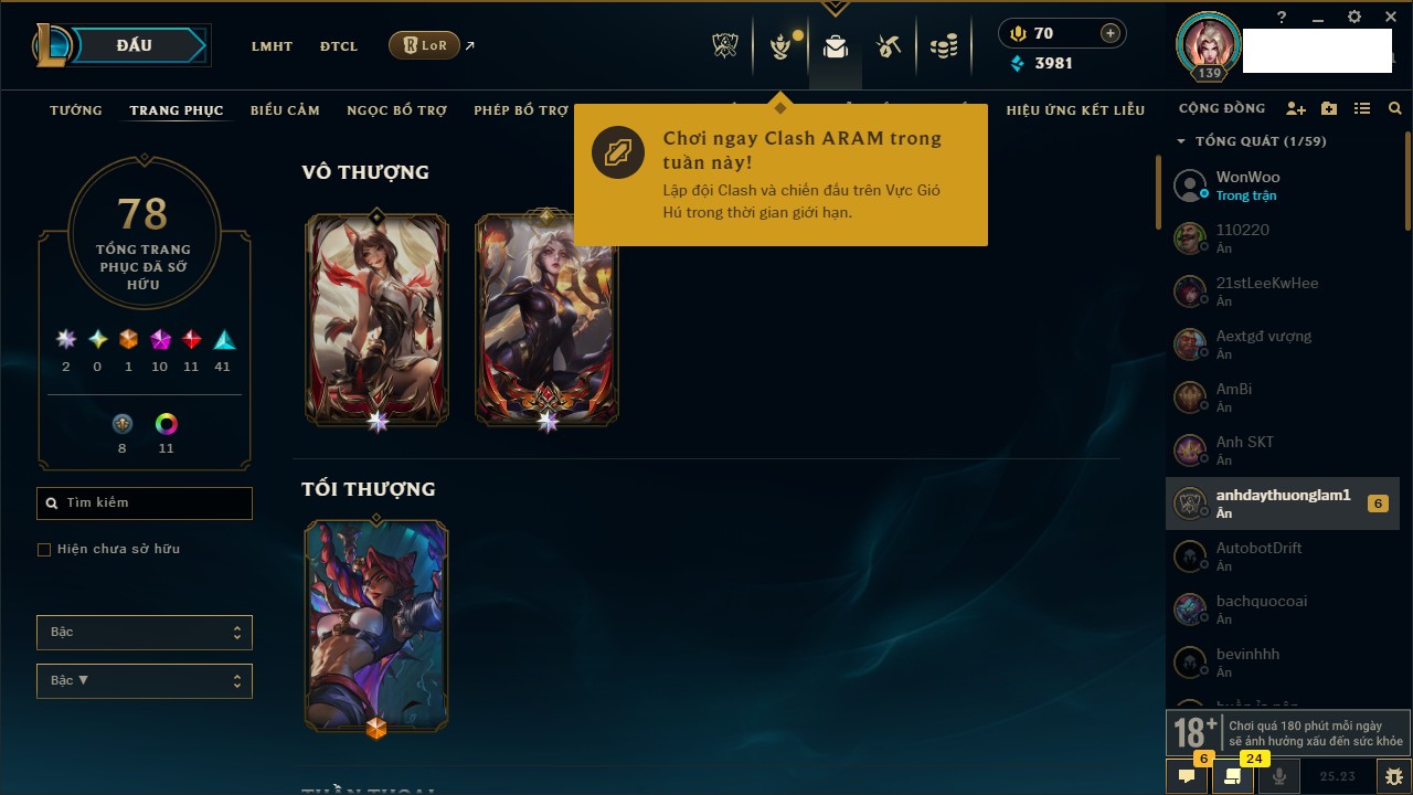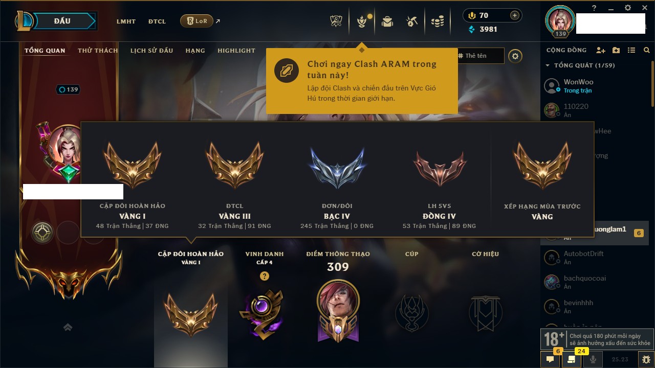 Rank Đơn: Bạch Kim III Khung: Bạch kim Tướng: 172 - Còn 76349 THX Trang Phục: 583 Rank ĐTCL: Chưa Rank Linh Thú: 278