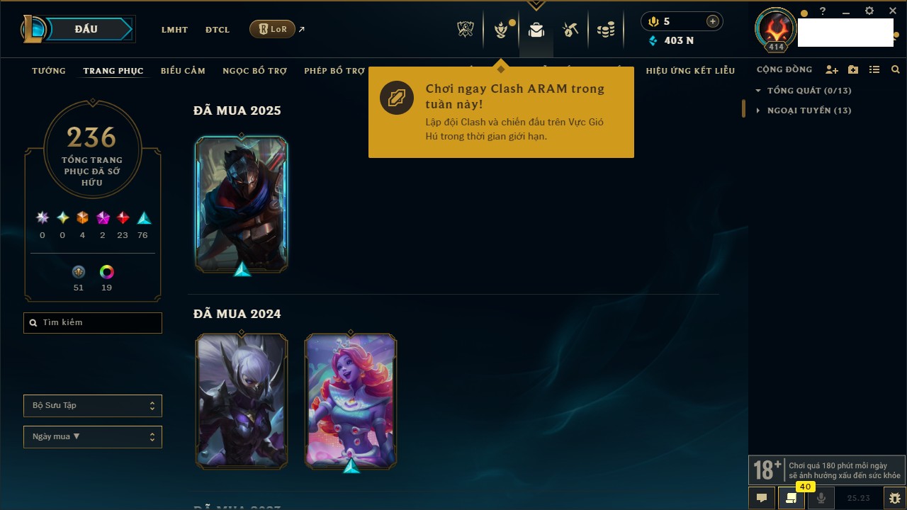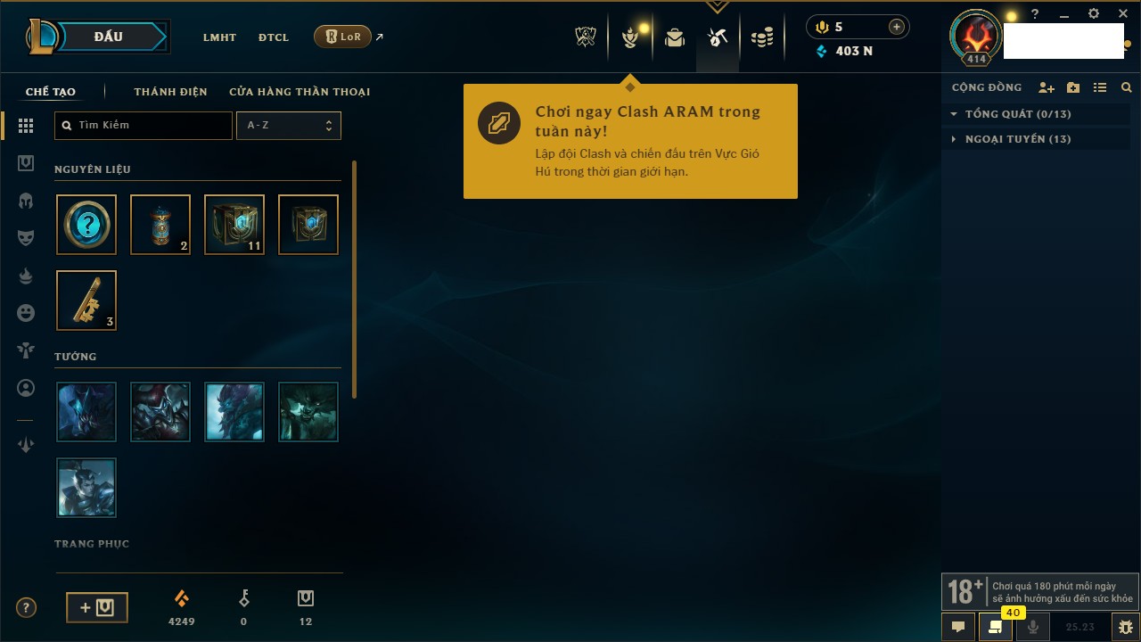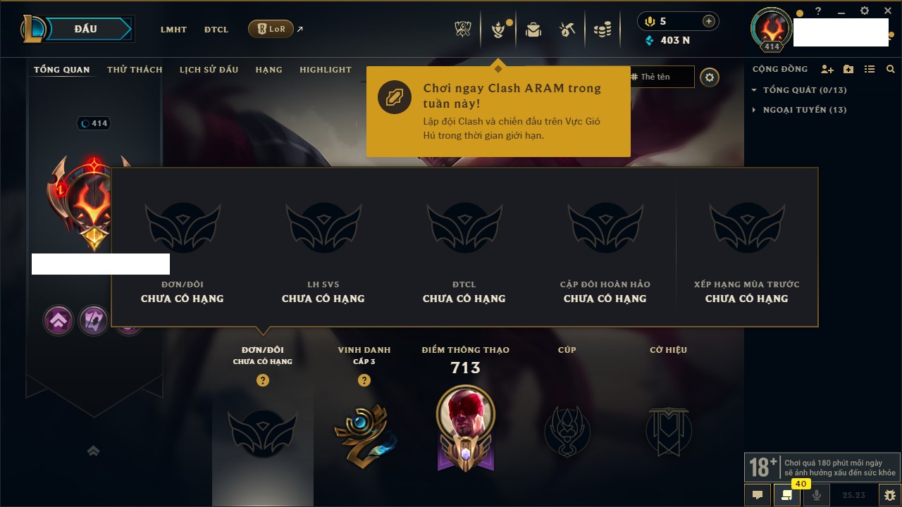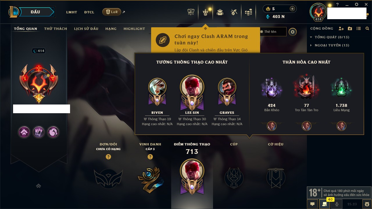 Rank Đơn: Chưa RankKhung: VàngTướng: 143 - Còn 16814 THXTrang Phục: 29Rank ĐTCL: Chưa RankLinh Thú: 91