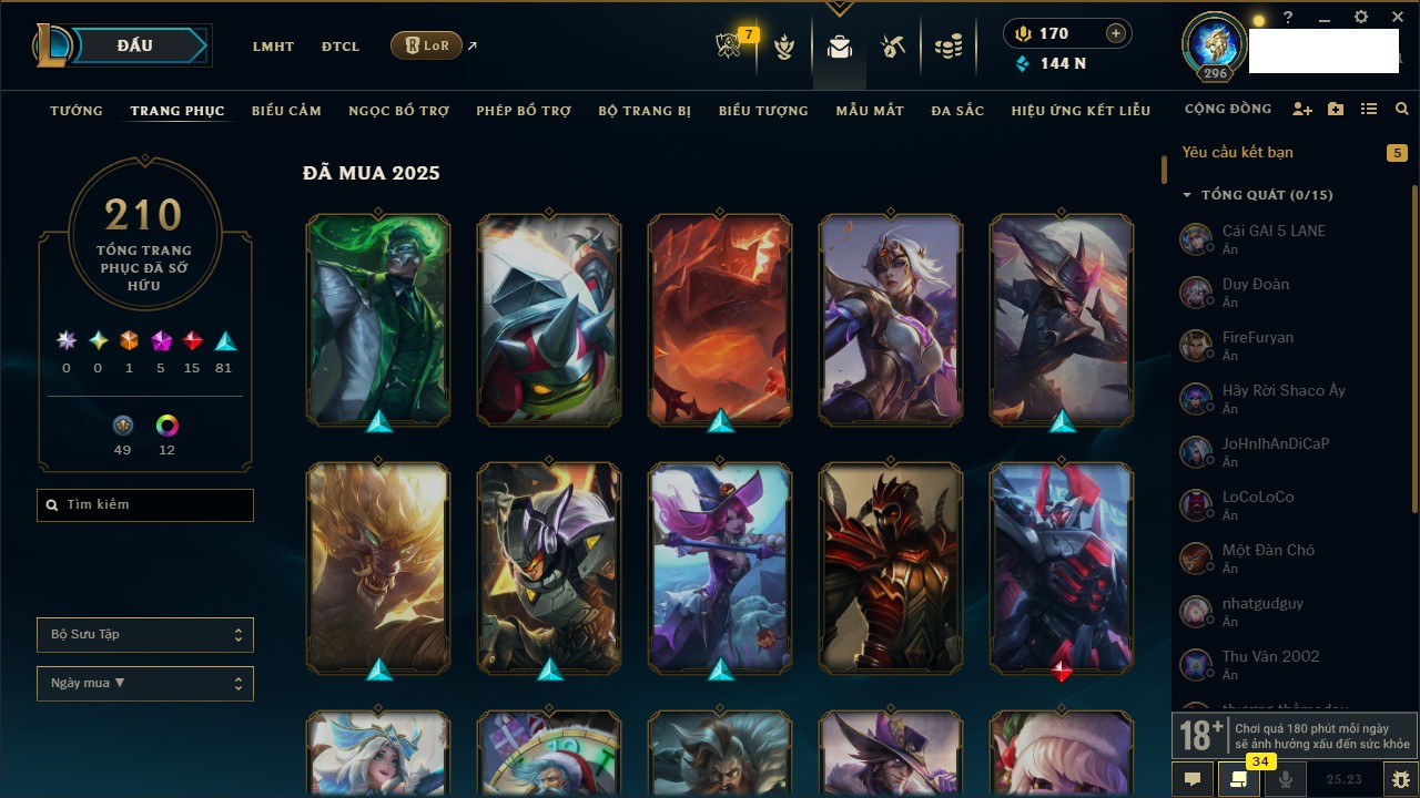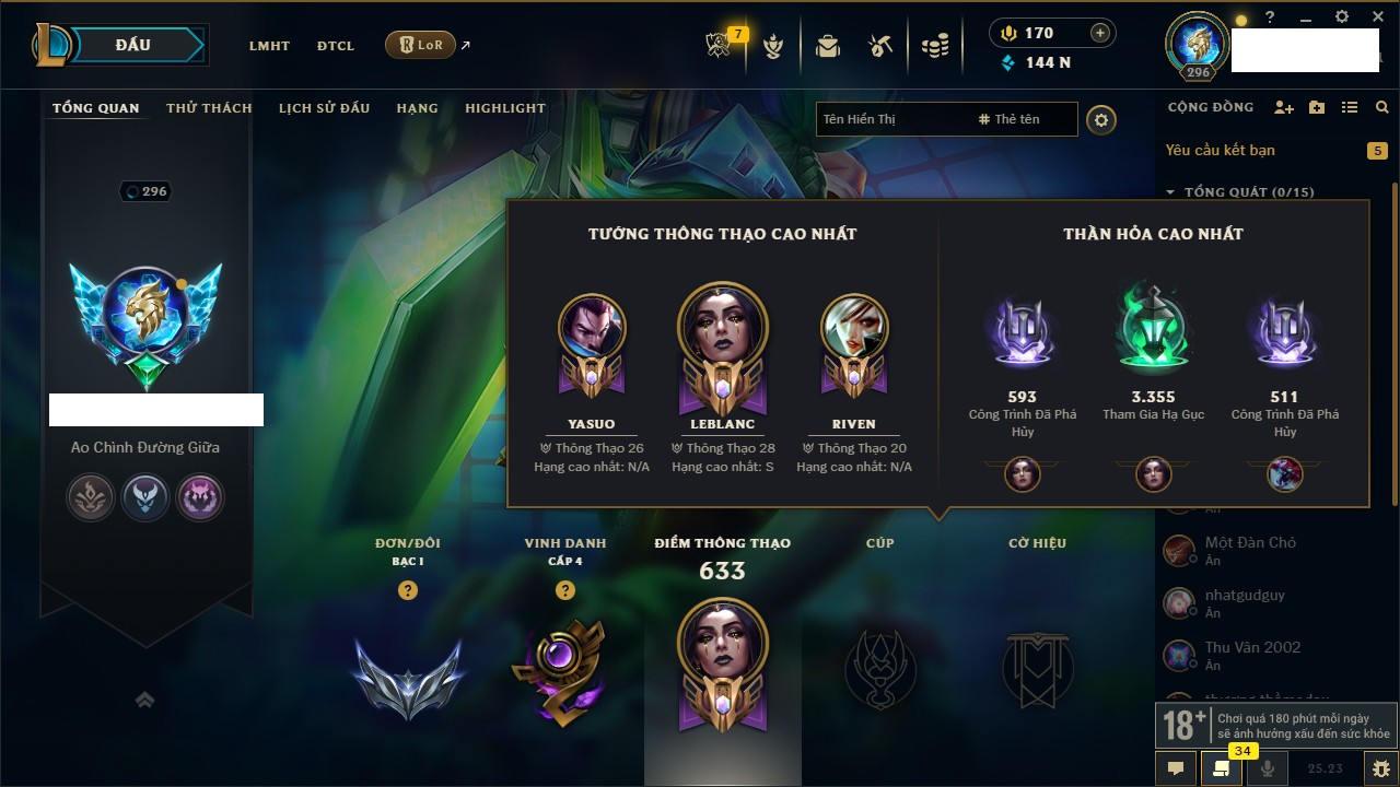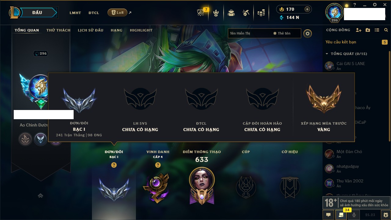 Rank Đơn: Bạc IIIKhung: BạcTướng: 171 - Còn 51045 THXTrang Phục: 220Rank ĐTCL: Sắt IILinh Thú: 141
