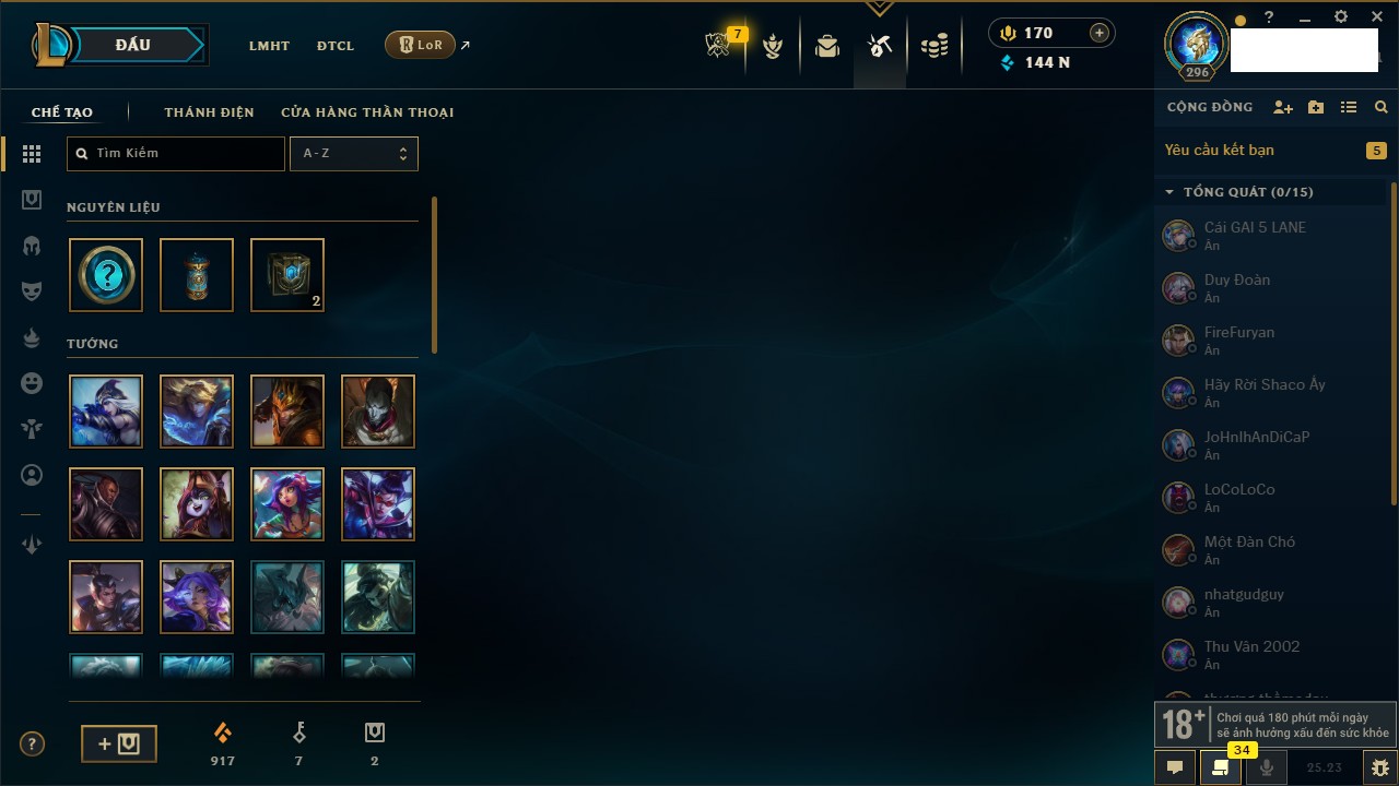 Rank Đơn: Vàng IKhung: VàngTướng: 171 - Còn 117995 THXTrang Phục: 199Rank ĐTCL: Lục Bảo IILinh Thú: 74