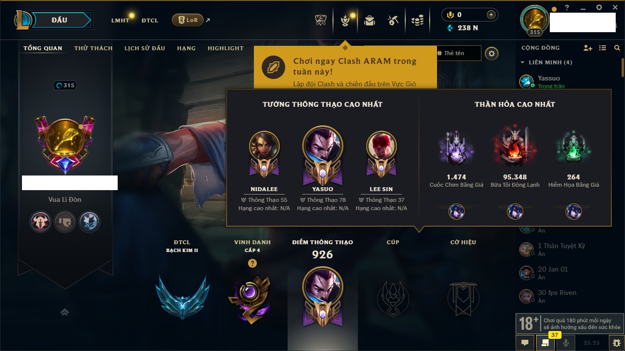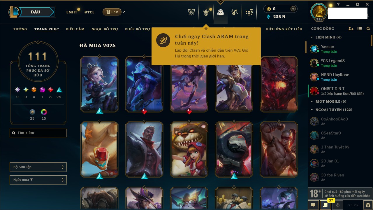 Rank Đơn: Đồng IKhung: ĐồngTướng: 168 - Còn 11447 THXTrang Phục: 245Rank ĐTCL: Chưa RankLinh Thú: 53
