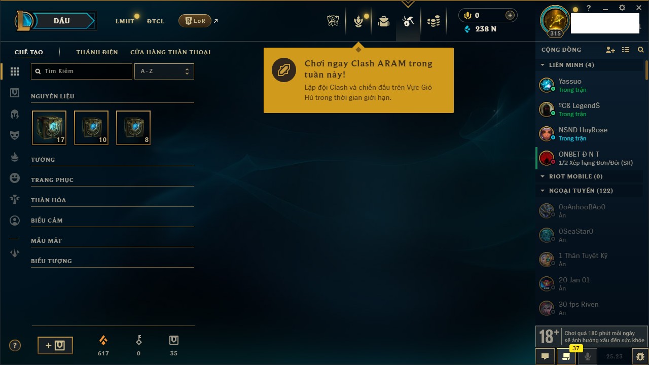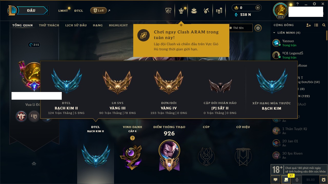 Rank Đơn: Vàng IIIKhung: BạcTướng: 171 - Còn 101359 THXTrang Phục: 88Rank ĐTCL: Kim Cương IVLinh Thú: 200