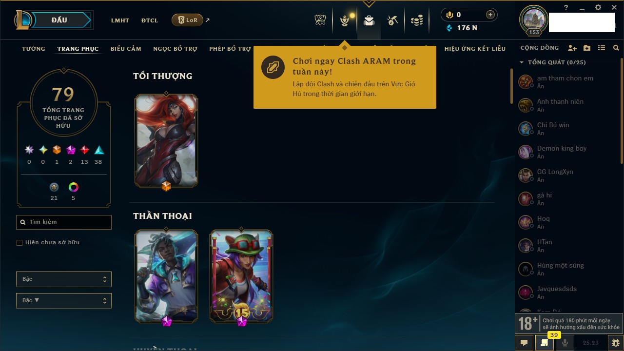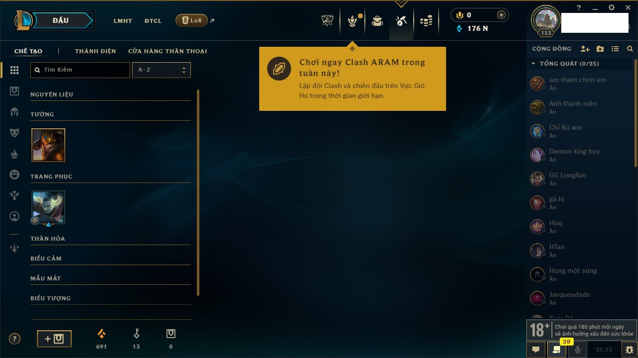 Rank Đơn: Vàng IIIKhung: VàngTướng: 172 - Còn 164704 THXTrang Phục: 255Rank ĐTCL: Kim Cương IVLinh Thú: 156