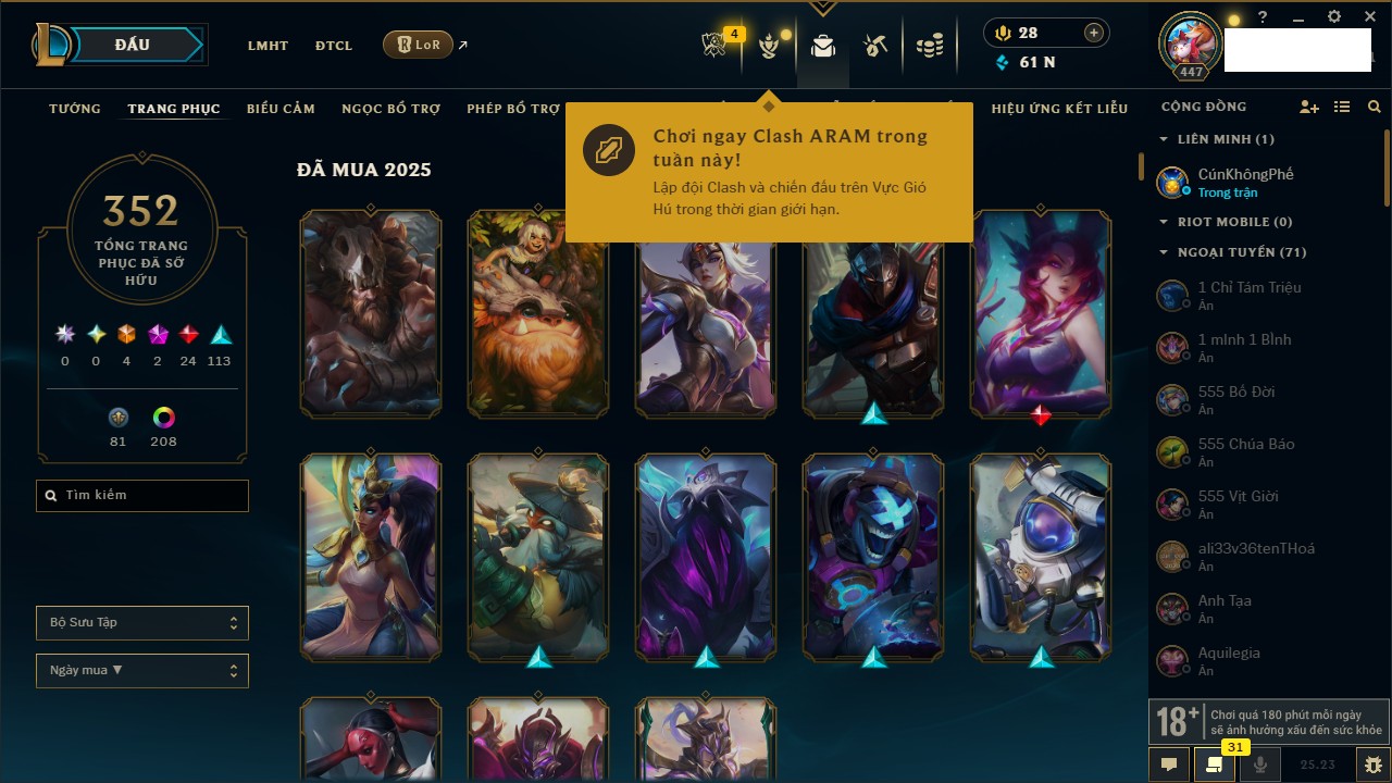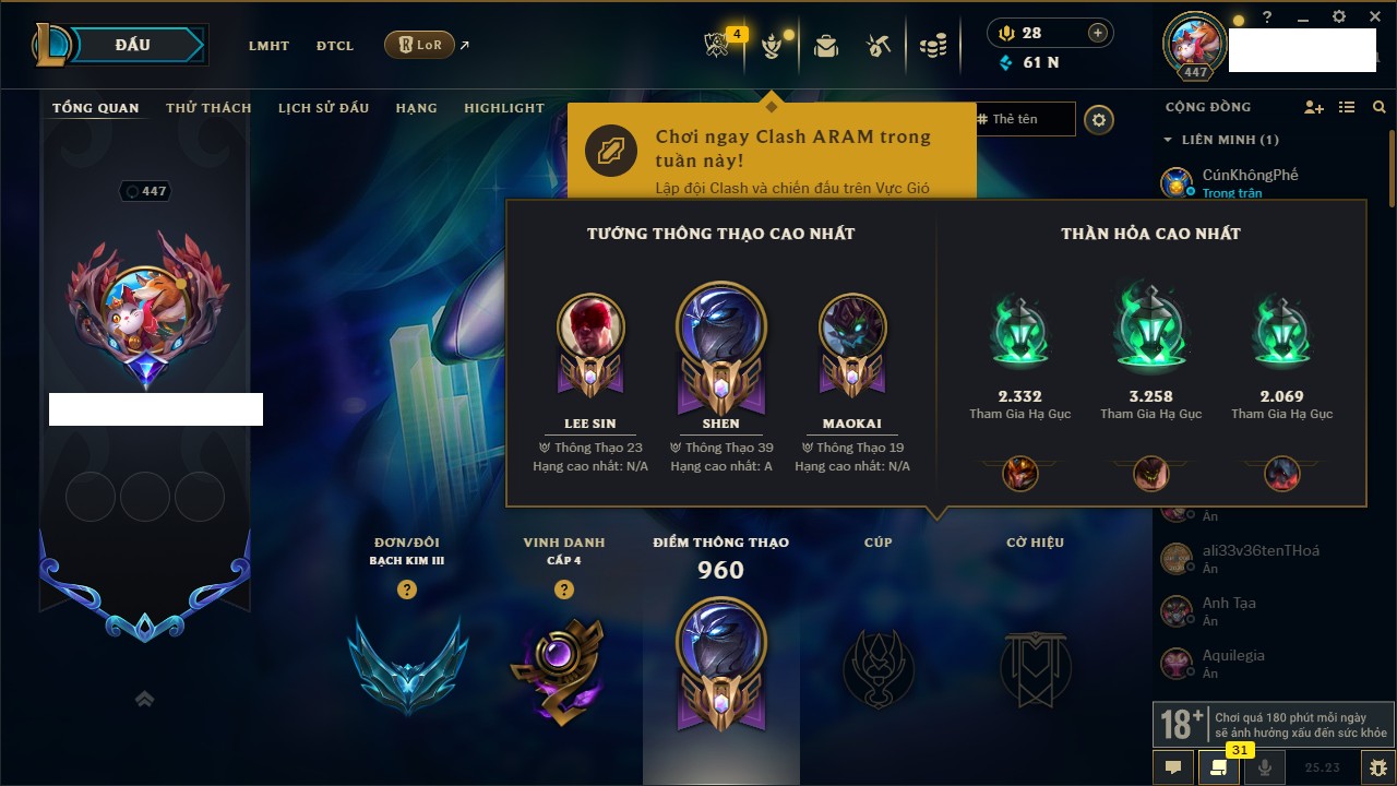 Rank Đơn: Vàng IKhung: Bạch kimTướng: 170 - Còn 212450 THXTrang Phục: 214Rank ĐTCL: Bạch Kim IVLinh Thú: 221