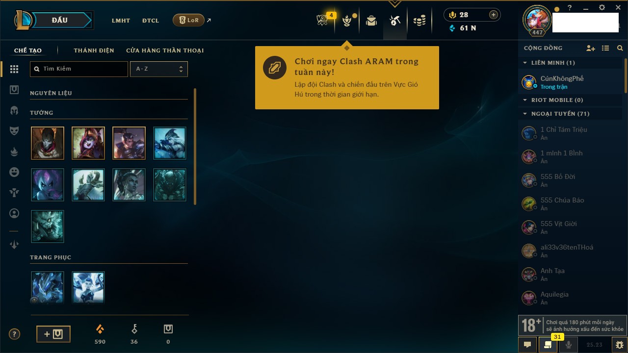 Rank Đơn: Bạch Kim IIIKhung: Bạch kimTướng: 170 - Còn 61079 THXTrang Phục: 352Rank ĐTCL: Sắt IILinh Thú: 70