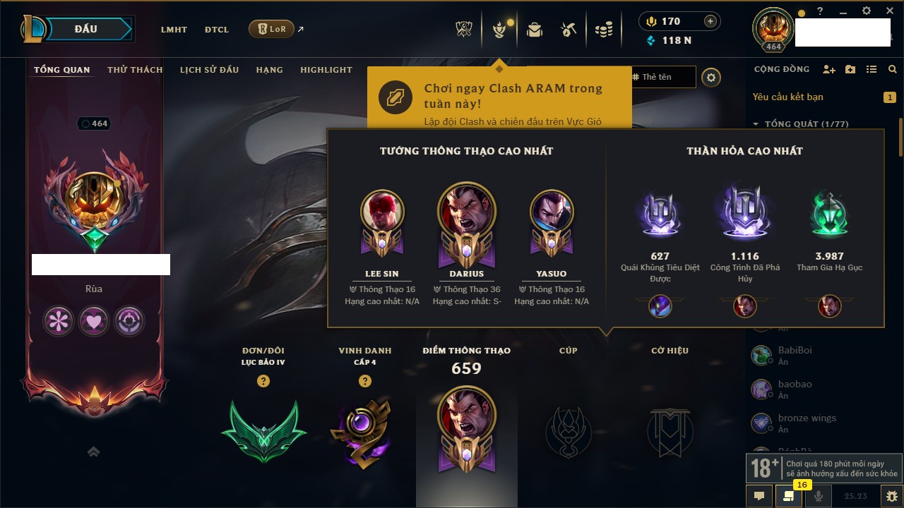Rank Đơn: Bạc IKhung: Bạch kimTướng: 86 - Còn 1608 THXTrang Phục: 47Rank ĐTCL: Chưa RankLinh Thú: 58