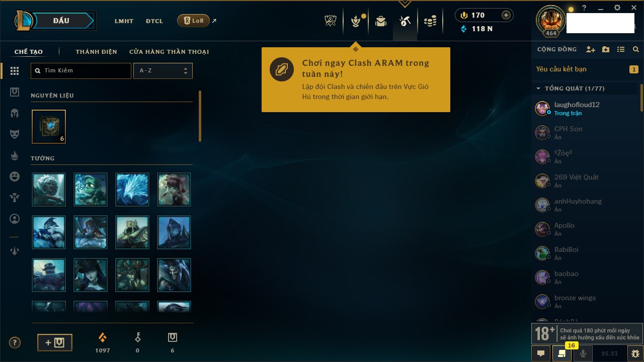 Rank Đơn: Chưa RankKhung: Chưa có khungTướng: 170 - Còn 14503 THXTrang Phục: 180Rank ĐTCL: Chưa RankLinh Thú: 131