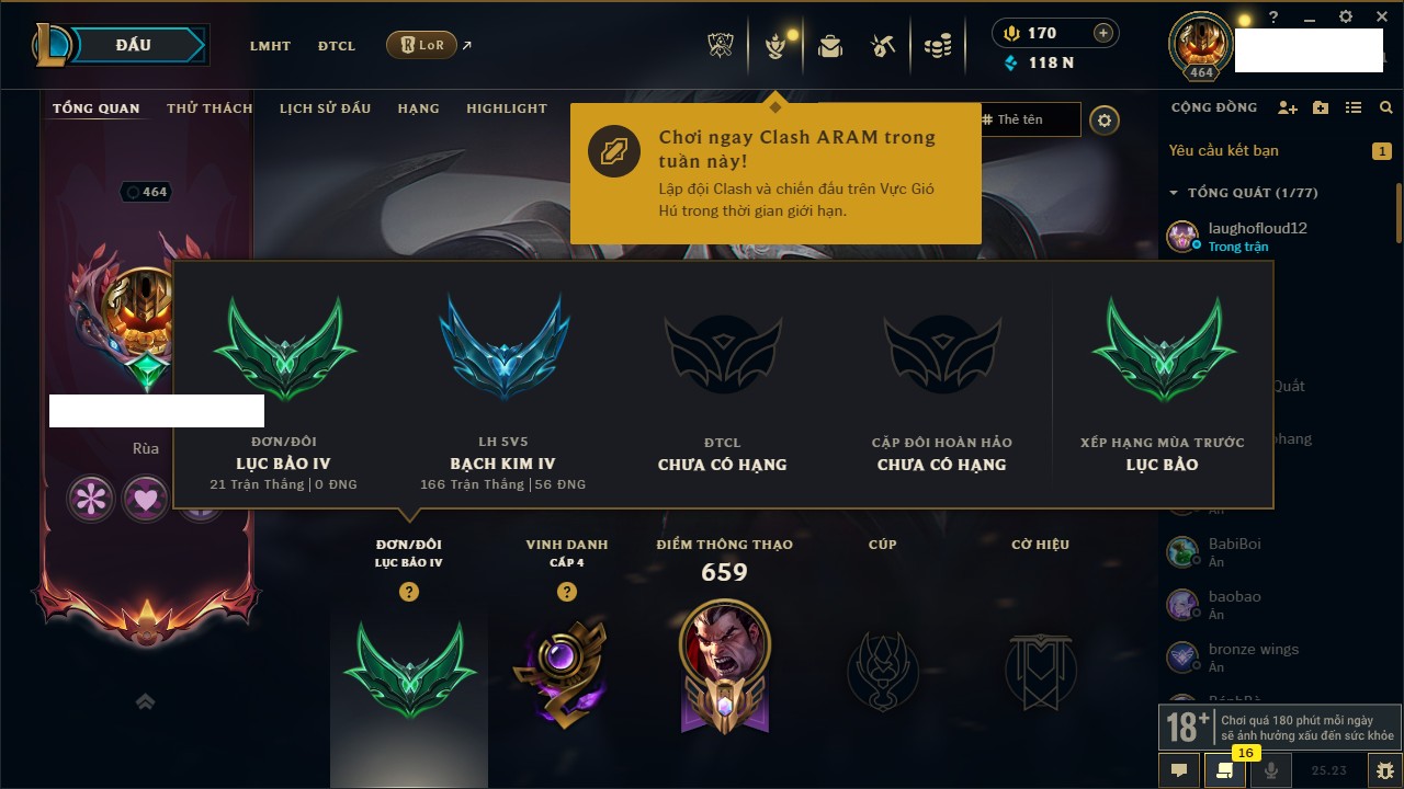Rank Đơn: Bạc IIIKhung: BạcTướng: 170 - Còn 76760 THXTrang Phục: 235Rank ĐTCL: Chưa RankLinh Thú: 183