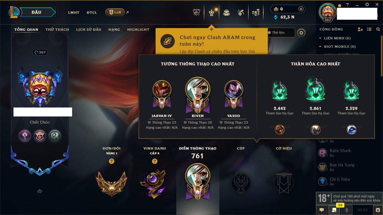 Rank Đơn: Bạch Kim IIIKhung: Bạch kimTướng: 170 - Còn 61079 THXTrang Phục: 352Rank ĐTCL: Sắt IILinh Thú: 70