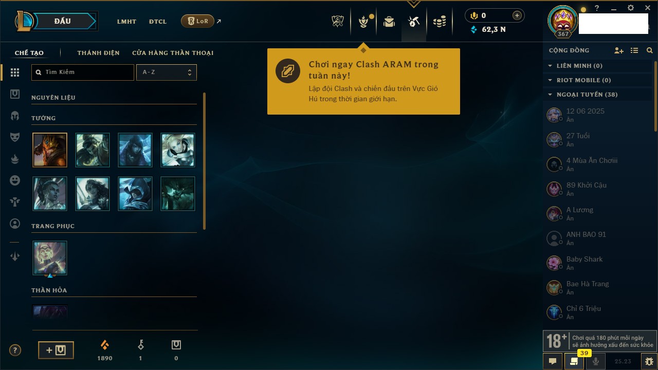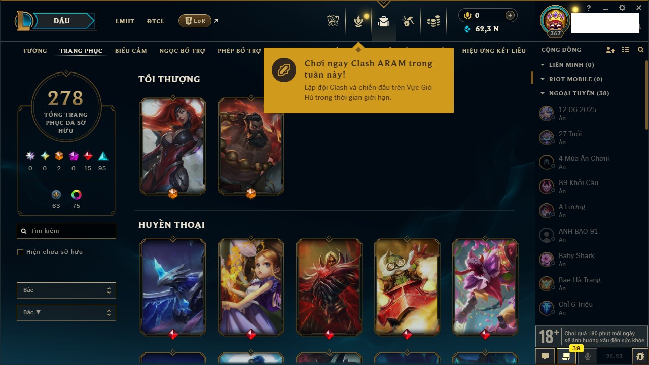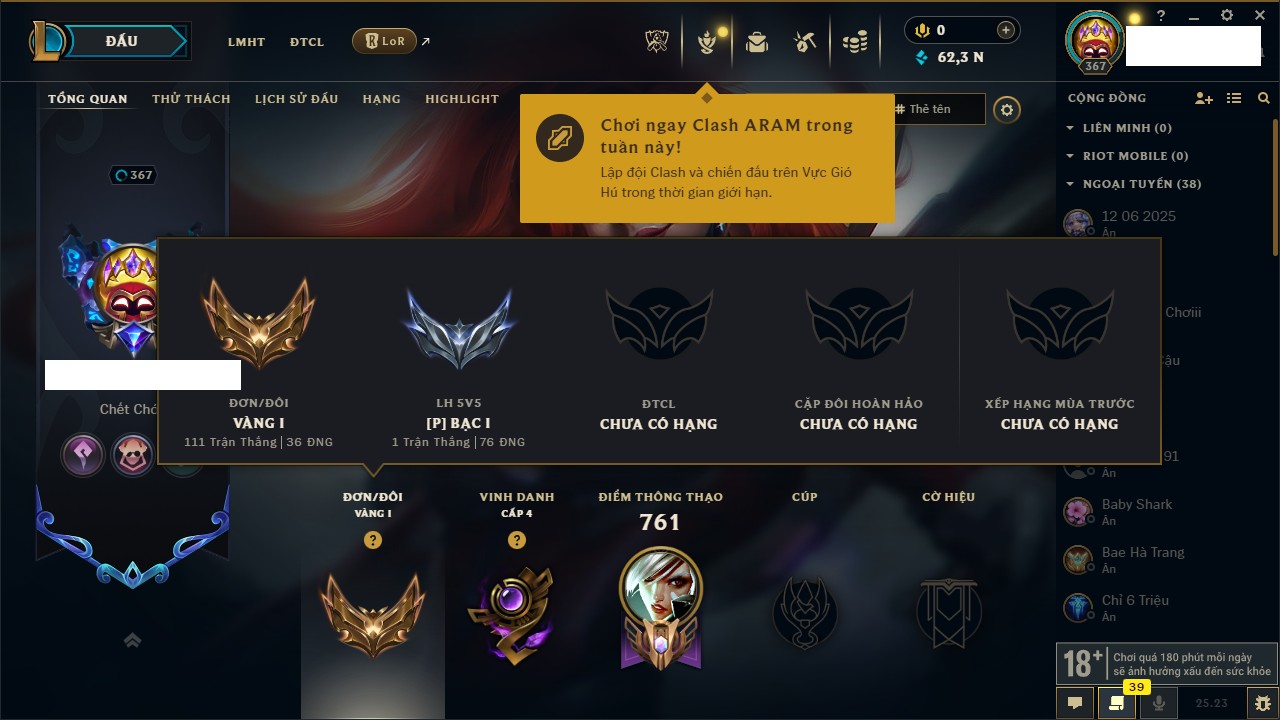 Rank Đơn: Vàng IKhung: Bạch kimTướng: 170 - Còn 212450 THXTrang Phục: 214Rank ĐTCL: Bạch Kim IVLinh Thú: 221