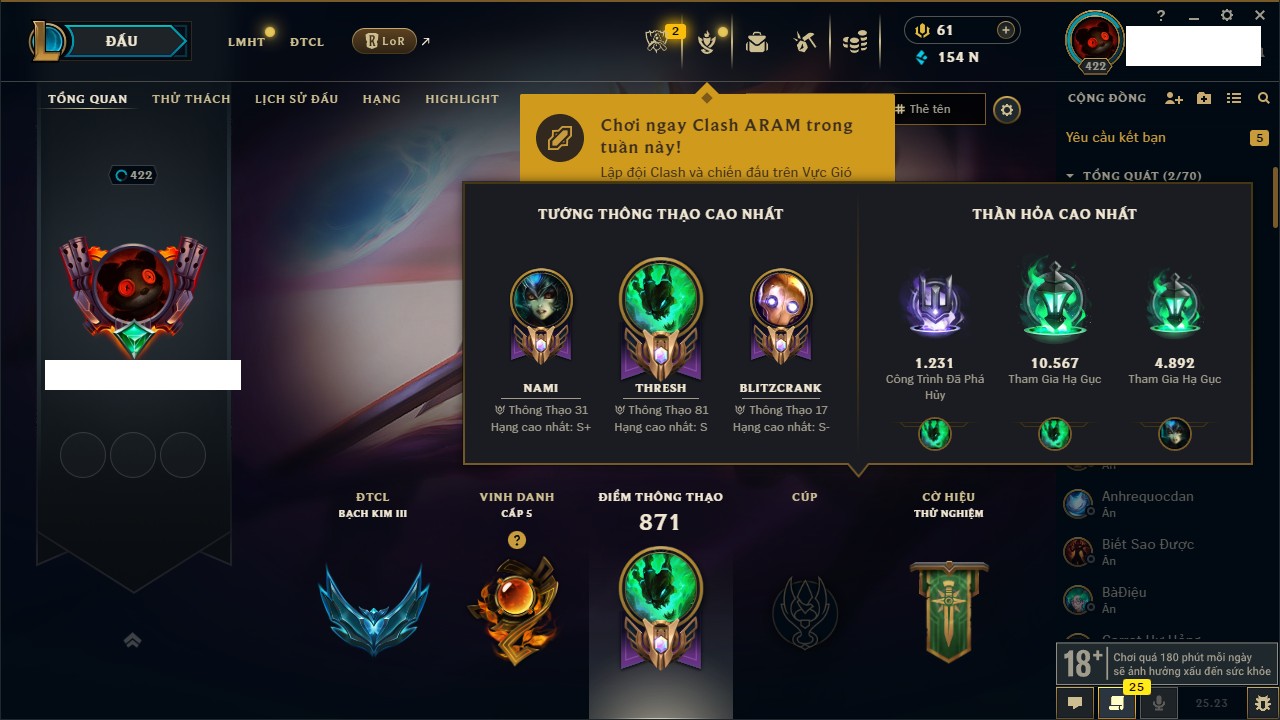Rank Đơn: Bạc IIKhung: Chưa có khungTướng: 145 - Còn 12230 THXTrang Phục: 183Rank ĐTCL: Chưa RankLinh Thú: 71