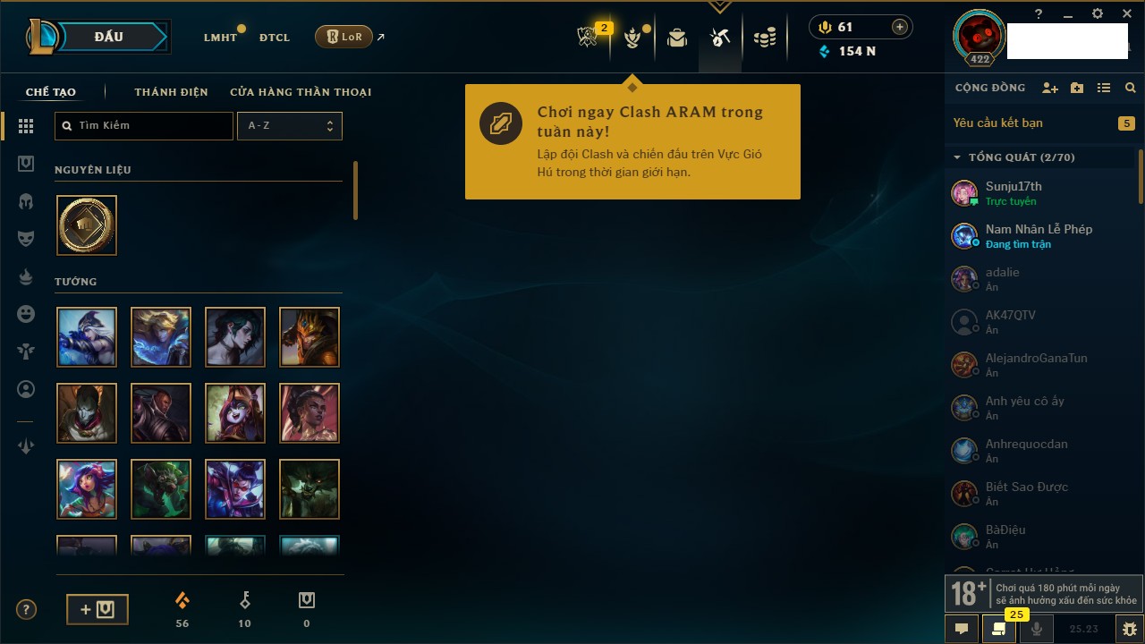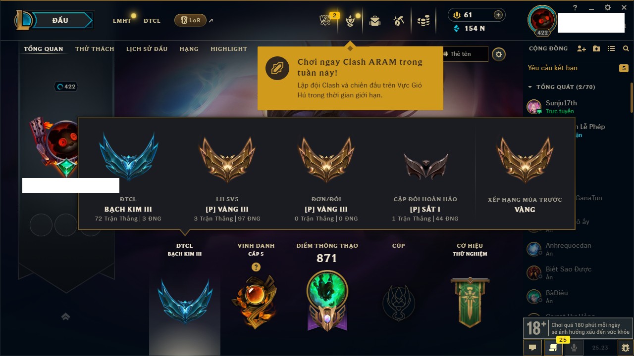 Rank Đơn: Vàng IKhung: VàngTướng: 171 - Còn 48001 THXTrang Phục: 212Rank ĐTCL: Vàng IILinh Thú: 94
