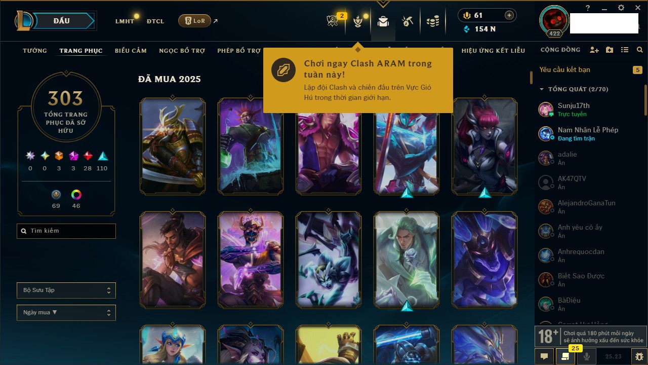 Rank Đơn: Chưa RankKhung: Chưa có khungTướng: 169 - Còn 43188 THXTrang Phục: 205Rank ĐTCL: Chưa RankLinh Thú: 259