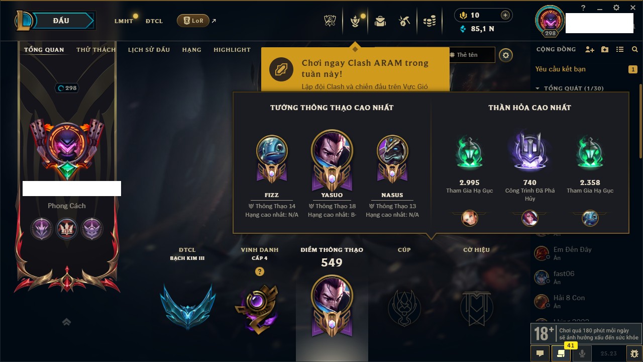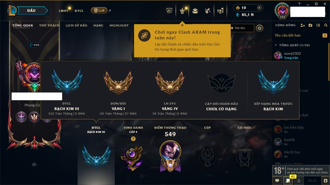 Rank Đơn: Vàng IIKhung: Bạch kimTướng: 172 - Còn 123420 THXTrang Phục: 231Rank ĐTCL: Bạch Kim IVLinh Thú: 213