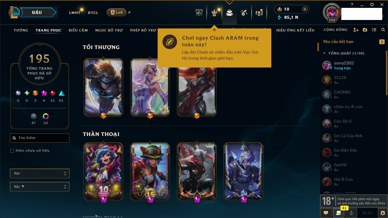 Rank Đơn: Vàng IIIKhung: VàngTướng: 172 - Còn 200315 THXTrang Phục: 87Rank ĐTCL: Chưa RankLinh Thú: 136