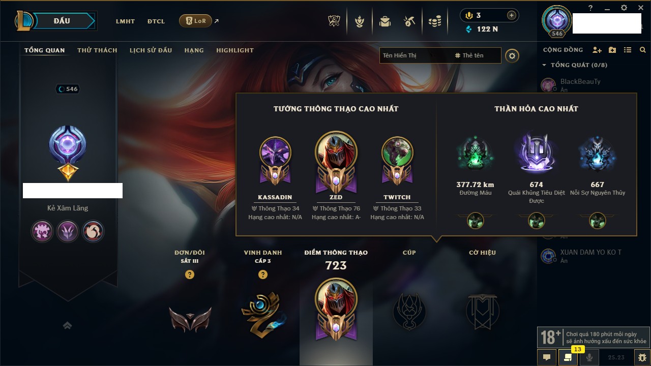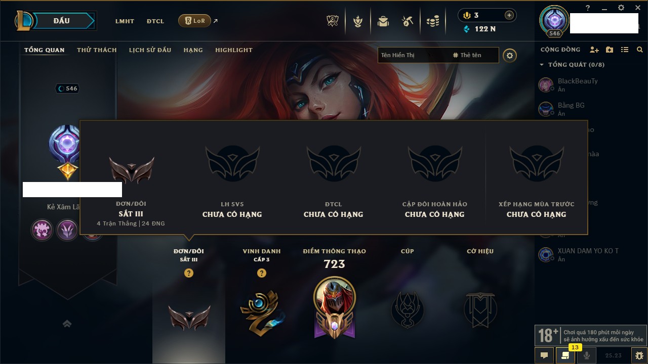 Rank Đơn: Đồng IIKhung: ĐồngTướng: 170 - Còn 66145 THXTrang Phục: 215Rank ĐTCL: Chưa RankLinh Thú: 52